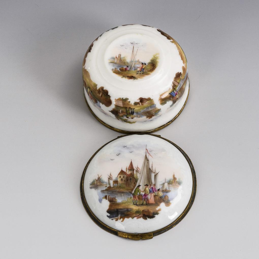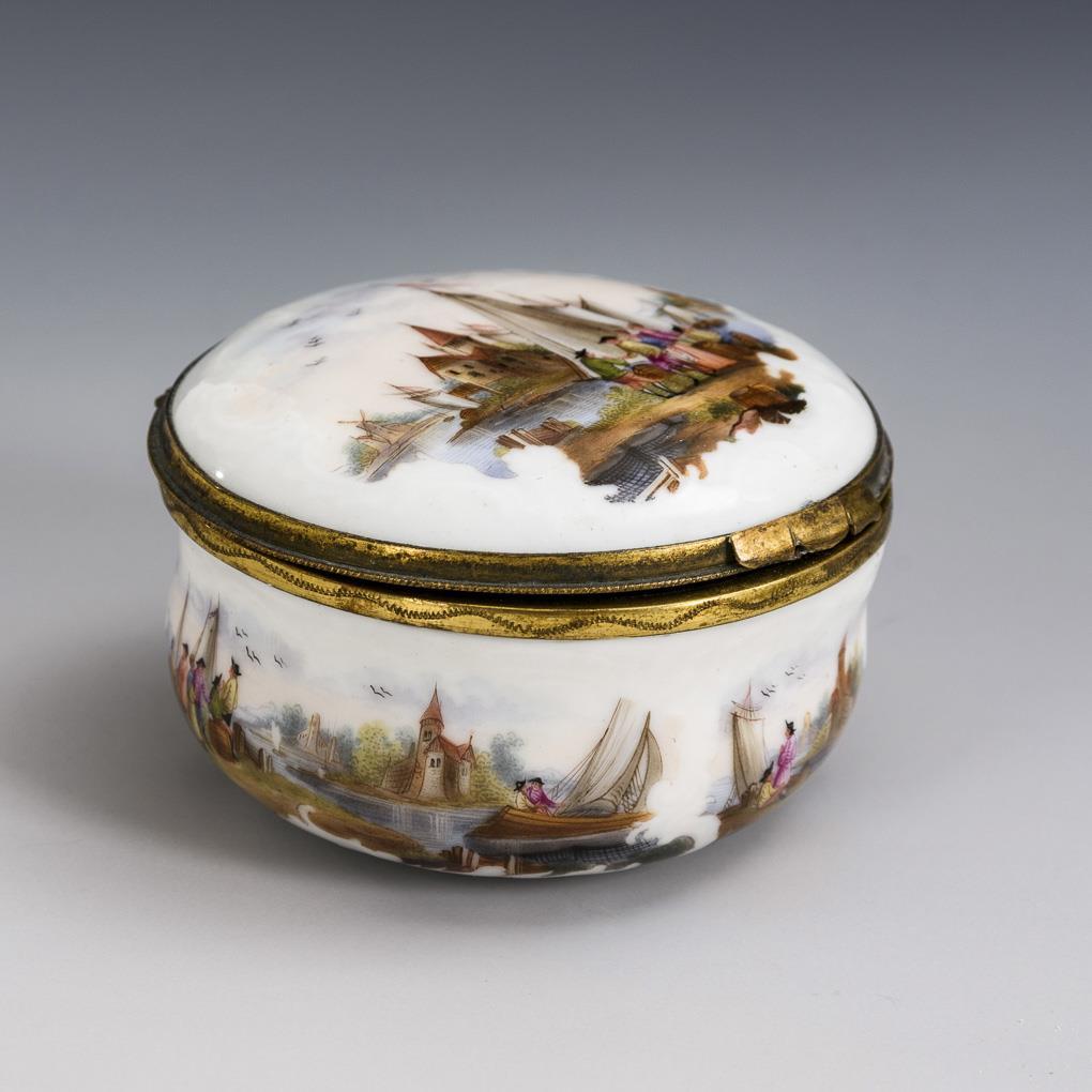 Round, inside gilded box with metal mounted hinged lid and rocaille relief. All sides depicting coastal landscapes with rich figural staffage. Interior gilt minimally rubbed.