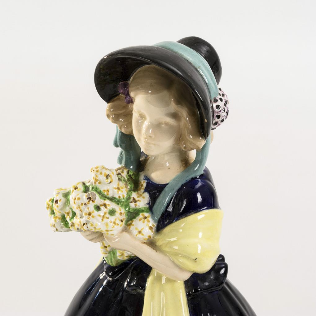 Hairline crack to neck and right arm, small rim chip to hat, slight bumping to bouquet.