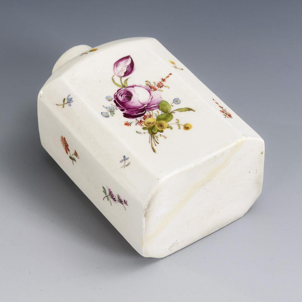 Rectangular tea caddy with cut corners and floral bouquets on both sides. Lid missing, restored hairline crack to base.
