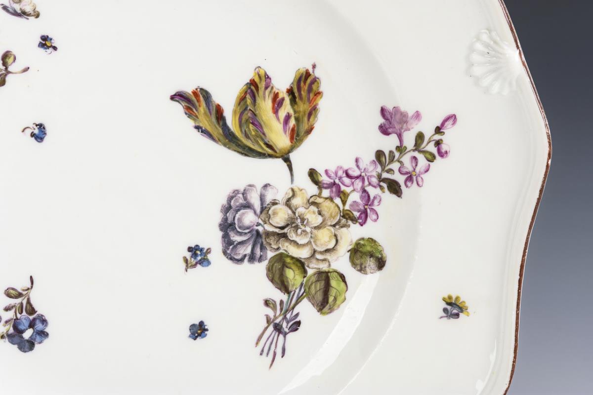 Mould so-called "Podewils-Façon". Multi-pass plate with shell relief in the spandrels. In the mirror a bouquet of flowers with tulip. Flag restored.
