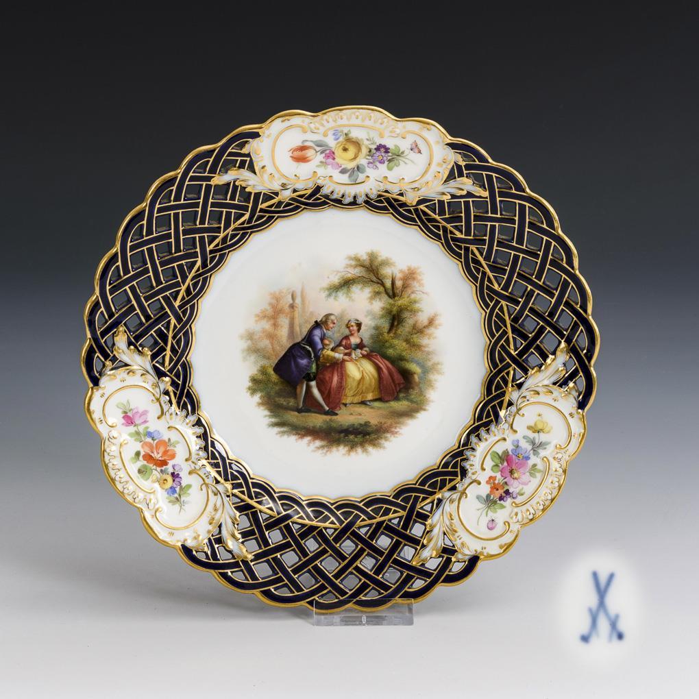 Plate with basket-pierced banner and small floral bouquets in three rocaille shields, in the mirror a landscape island with gallant couple.