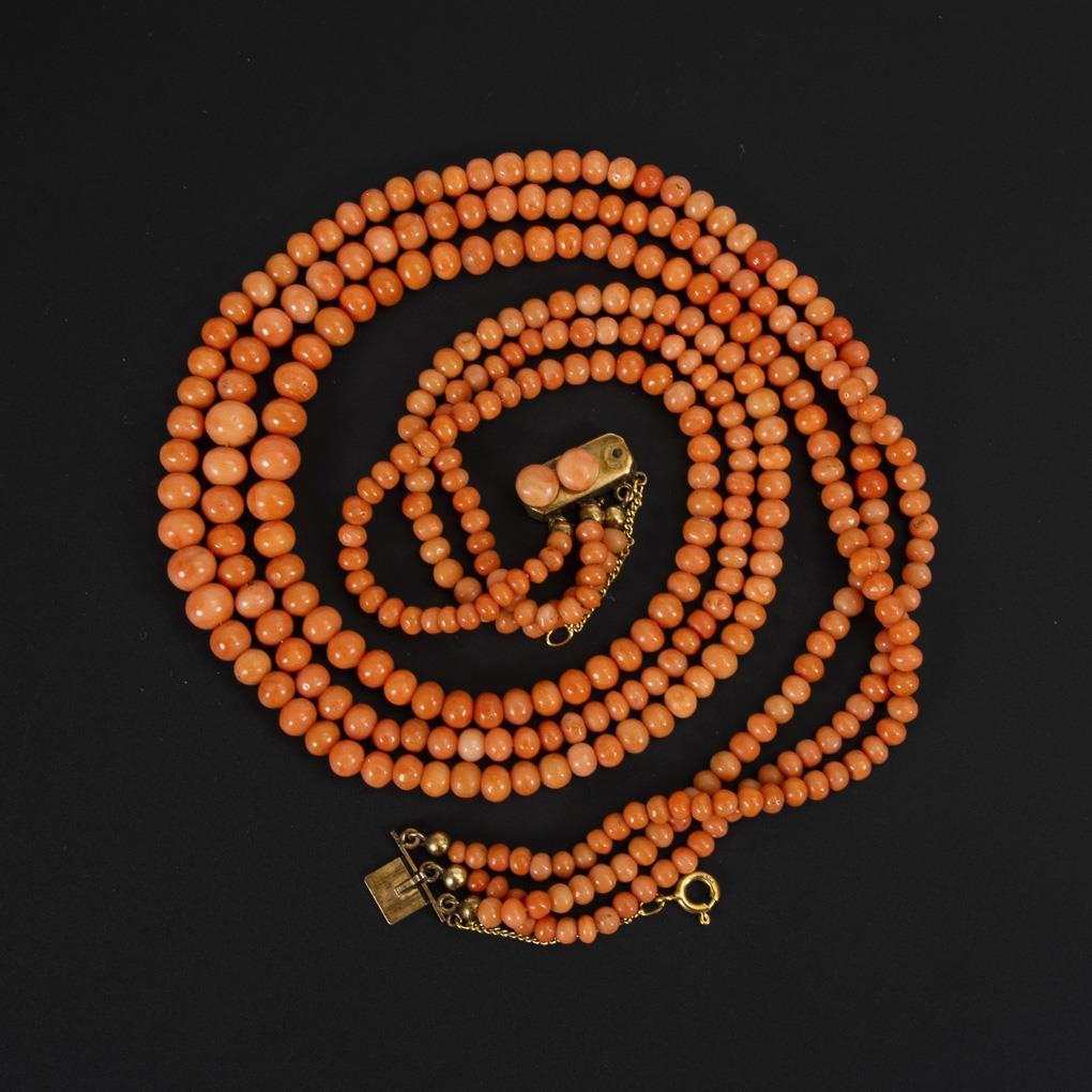 Lacing chains with coral balls in the course, on box lock with safety chain. 1 coral lens on clasp missing.