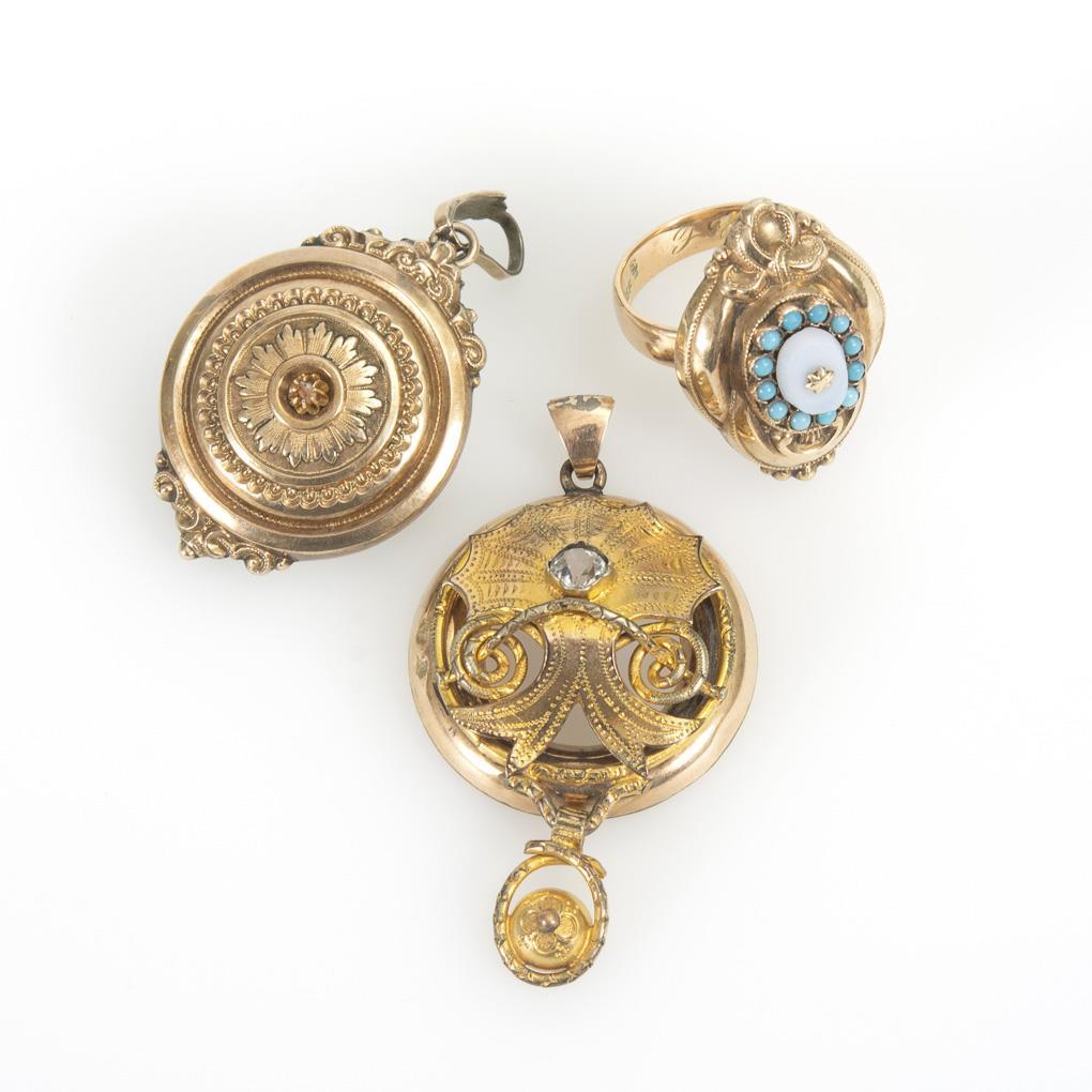 Biedermeier ring head on supplemented rail, late Biedermeier medallion/brooch with glazed framed reverse and Historism pendant.