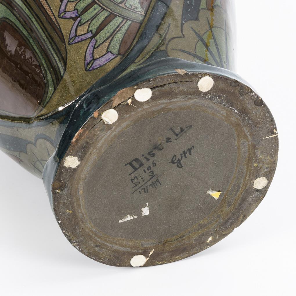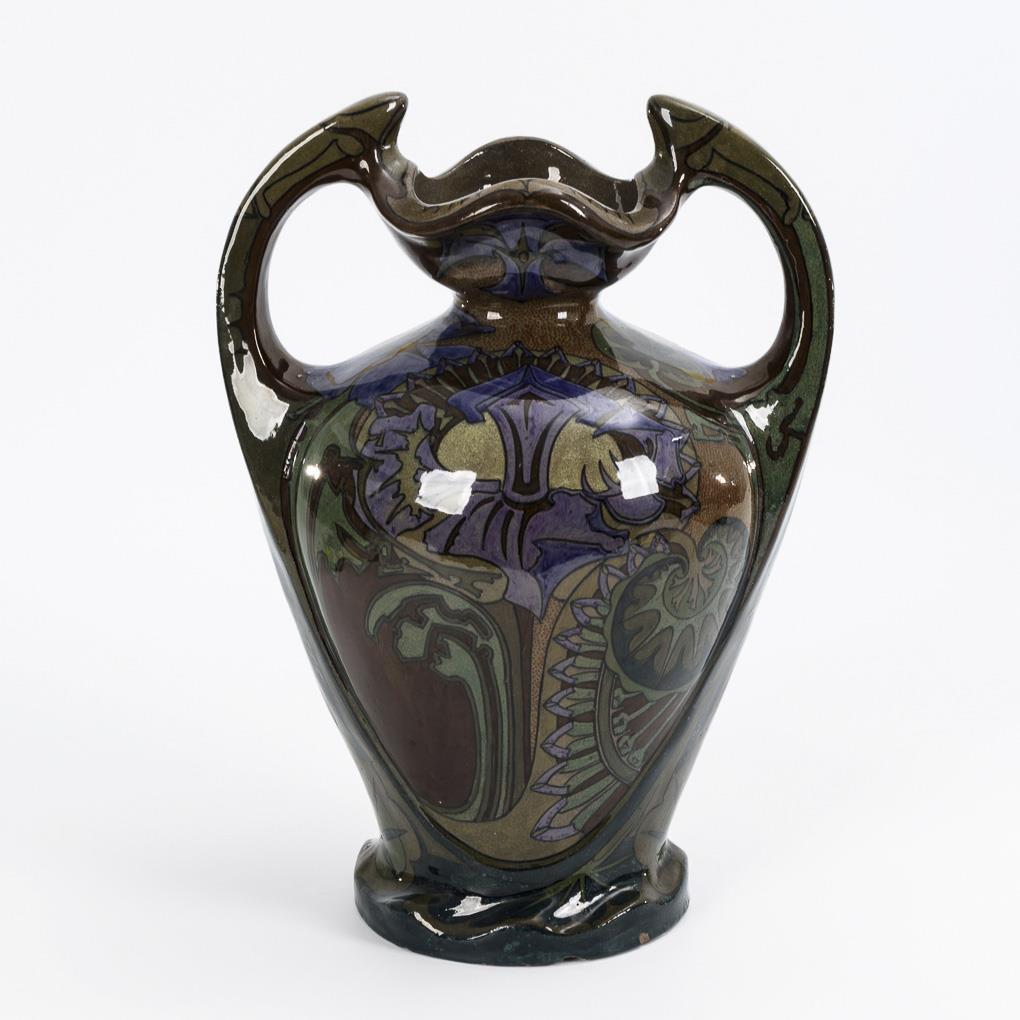 Large art nouveau handle vase with thistle decoration.