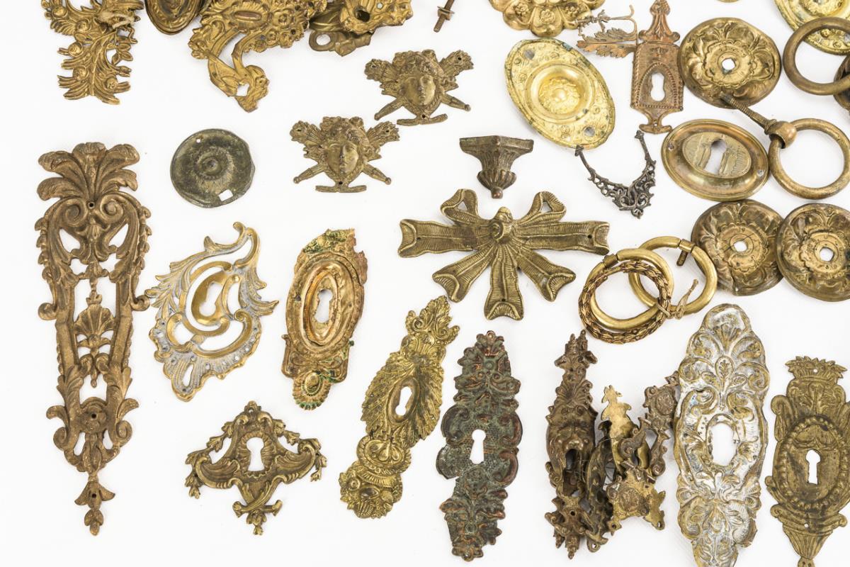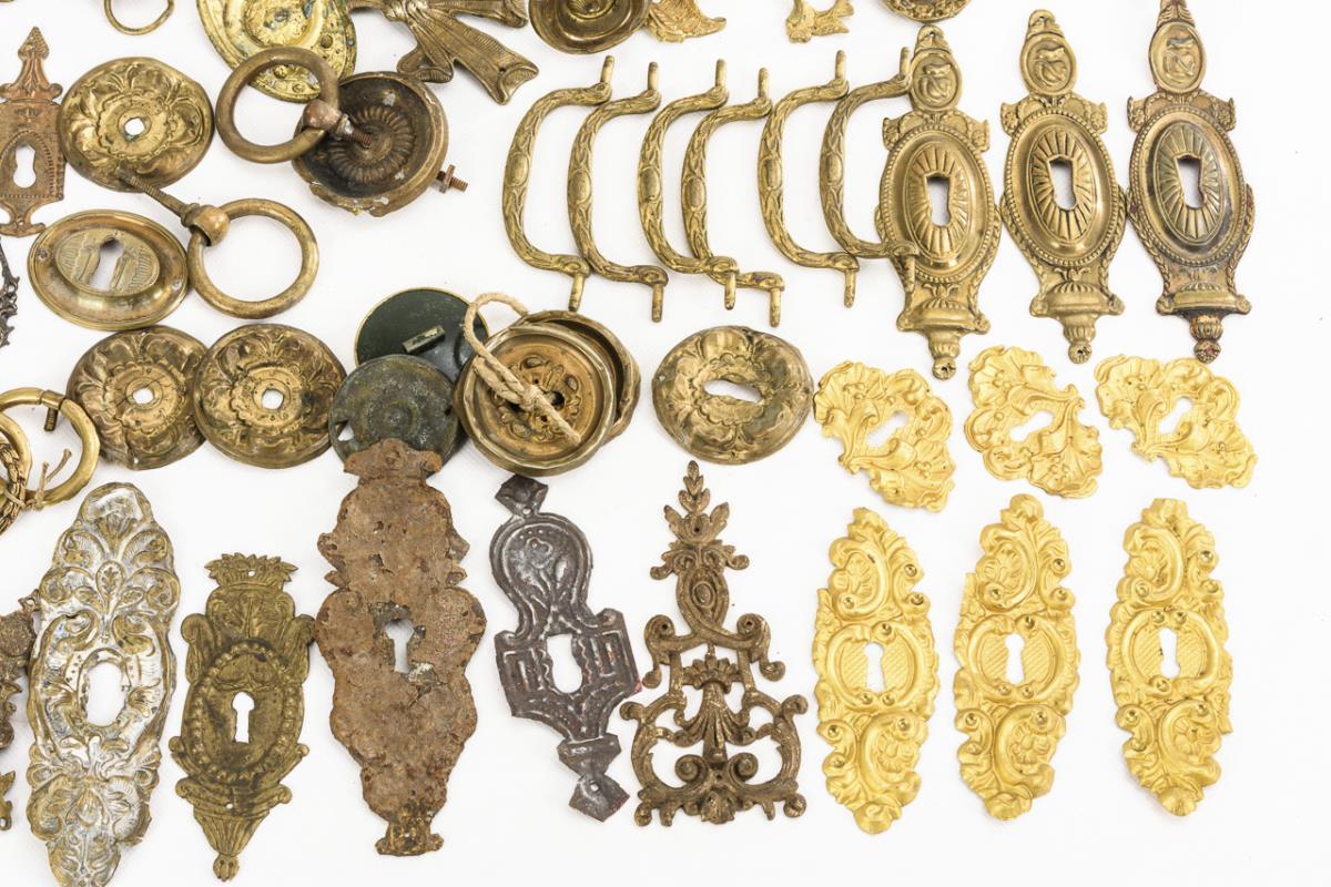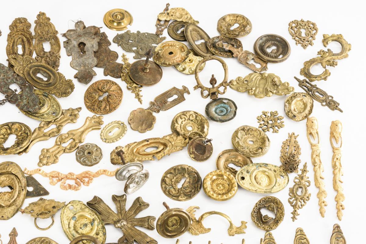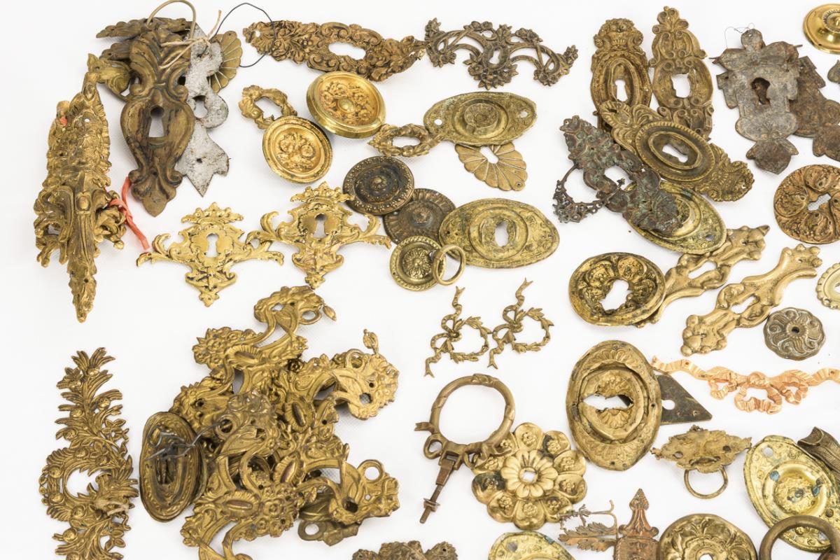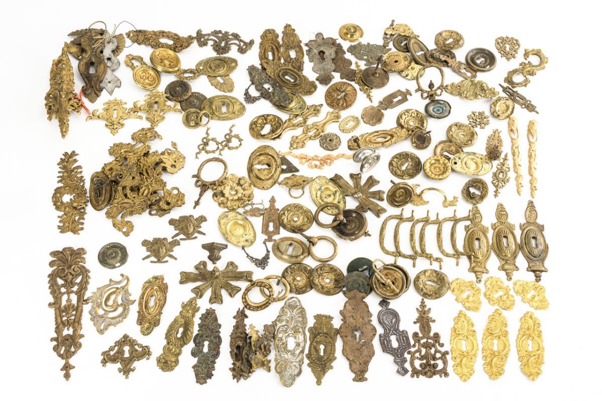 Handles and knobs, keyhole bezels and appliqués; partly in sets. Partly heavy signs of age/use, partly re-casts.