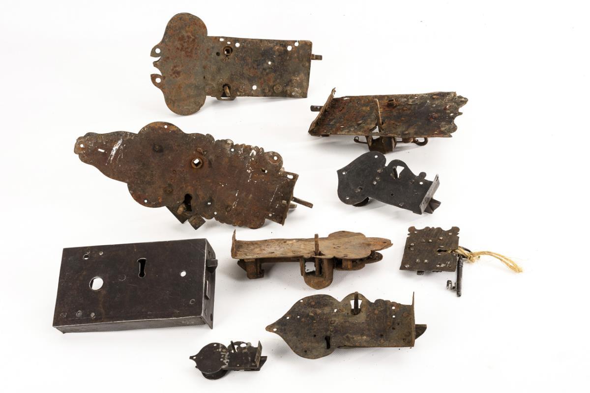 Locks with bolt (1x double-barrelled), 3x with lever latches, 2x separate interior latches, chapels partly with inset. 1 box lock. Partly missing parts and defects, mostly strong signs of age/use.