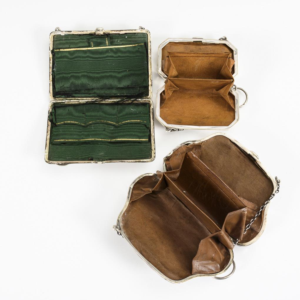 Elegant pouches on short chain, 1x with monogram engraving "WE". Partly heavily dented.