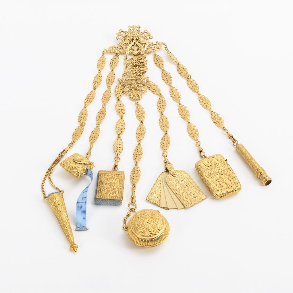 Fine cast crown with belt hook, chain links and 7 pendants on carabiners: 2 boxes (1x with inner mirror), centimeter measure, dance card with leaves of imitation ivory, 1 book symbol, 1 empty scabbard, 1 sheath with slider. 2 missing parts (for scabbard and sheath).