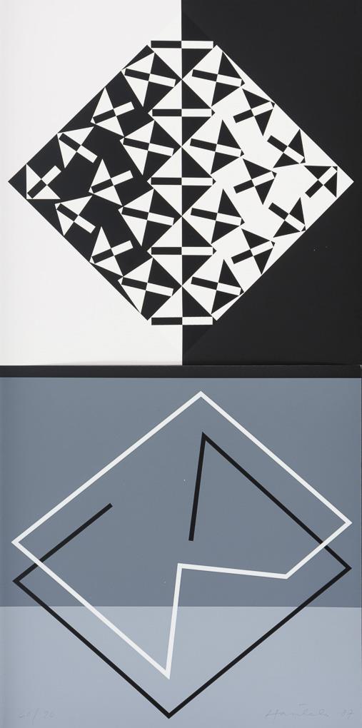 Complete, original portfolio of 5 constructivist works by Finnish artists Lars-Gunnar Nordström, Jorma Hautala, Matti Kujasalo, Jo Niemeyer and Jim Wichmann, with title page, published by Harald Arnkil, Helsinki 1987. Each margin minimally bumped.