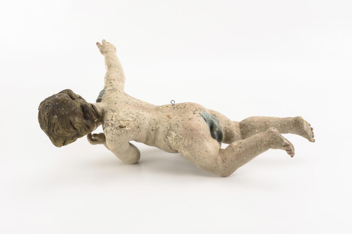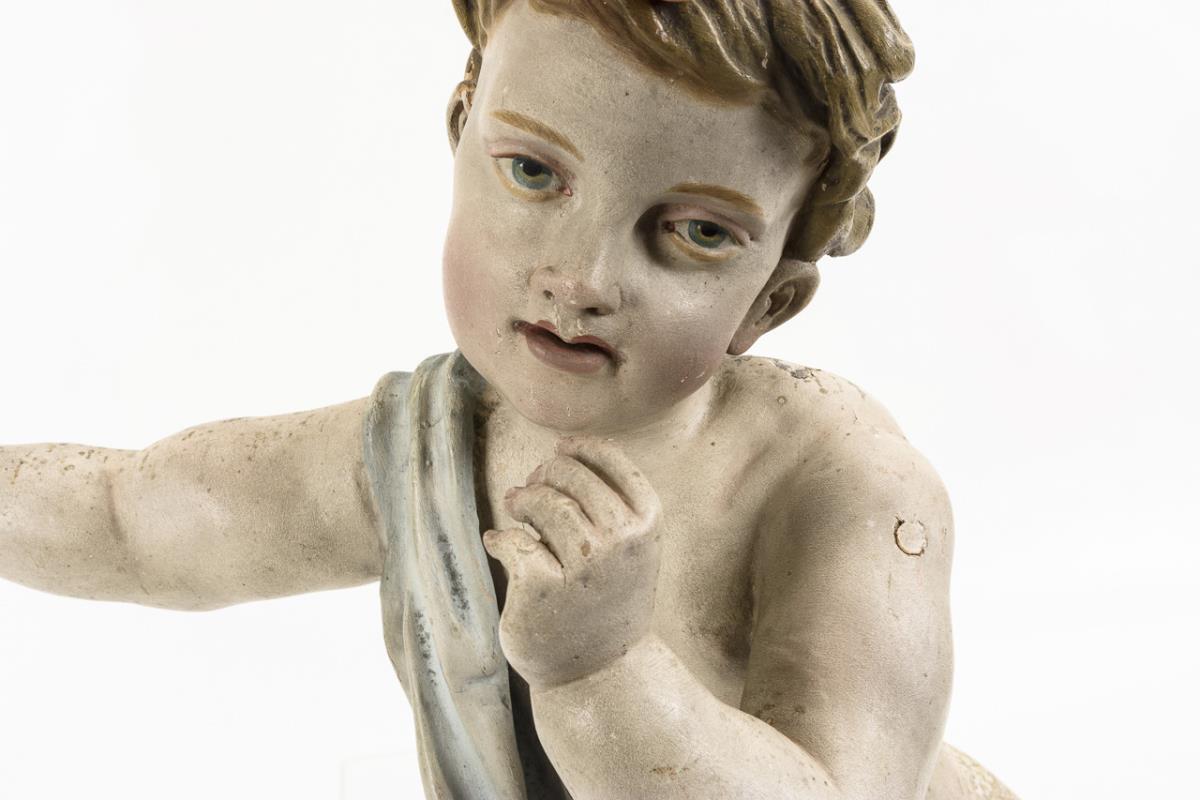 Floating fully plastic figure of the putto with pointing hand. 1 dry crack, minor hairline cracks, signs of age/use.