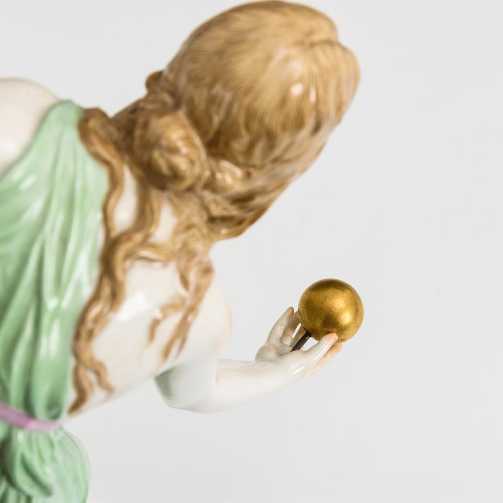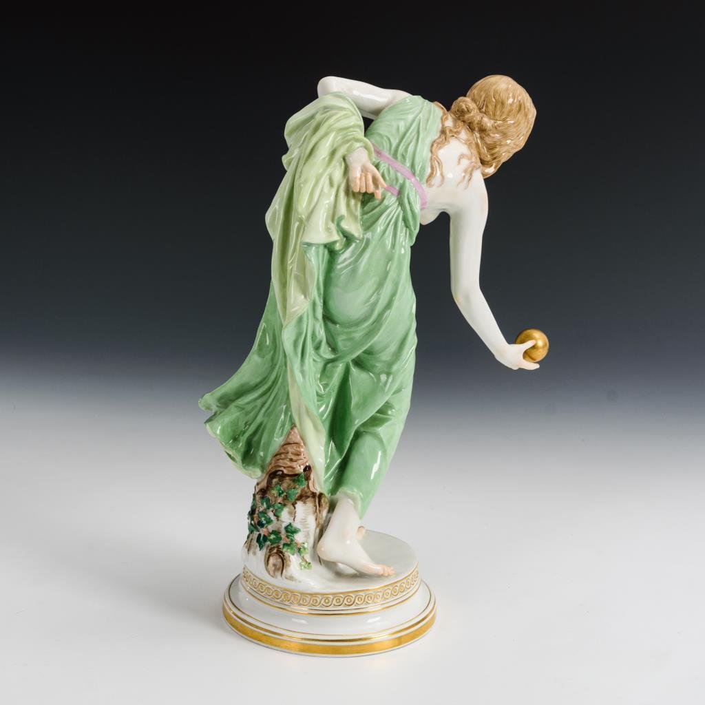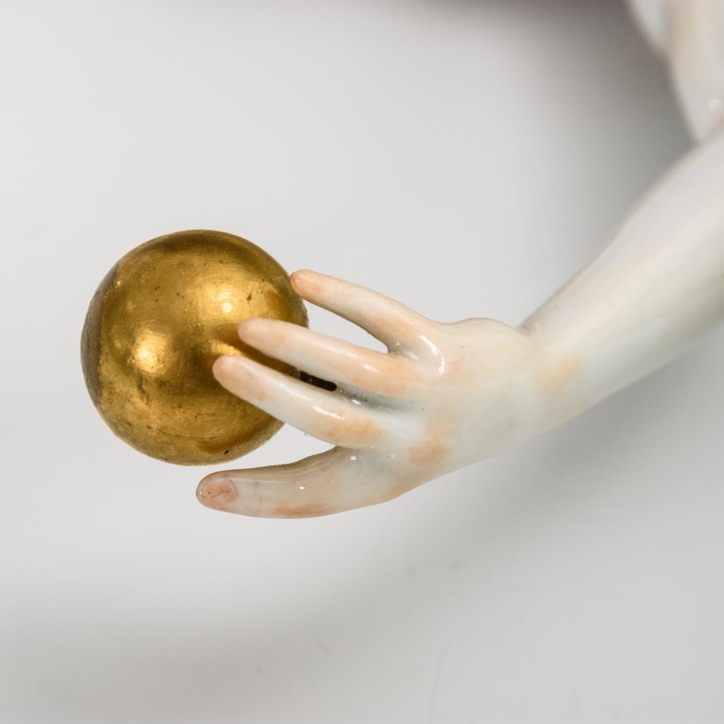 Bewegte Figur einer jungen, eine goldene Kugel werfenden Dame, auf profiliertem Rundsockel. 3 Efeublätter sowie Zeigefinger der rechten Hand restauriert.
