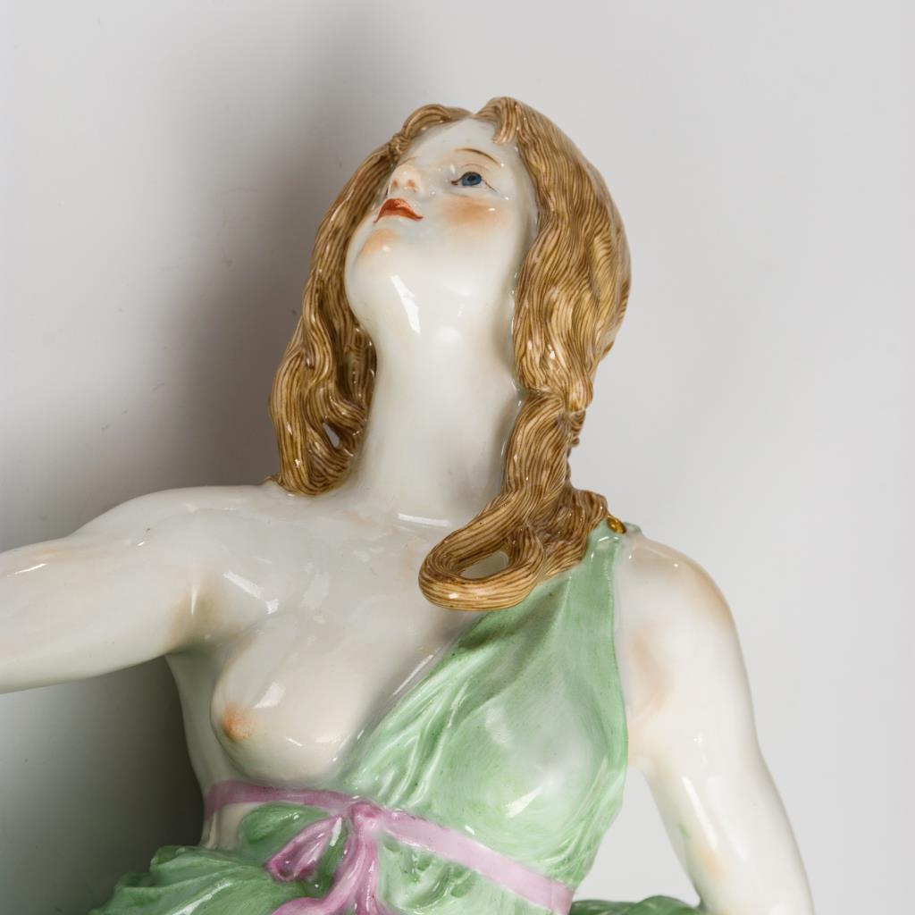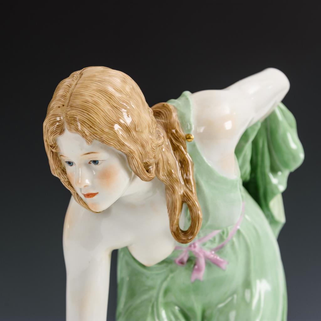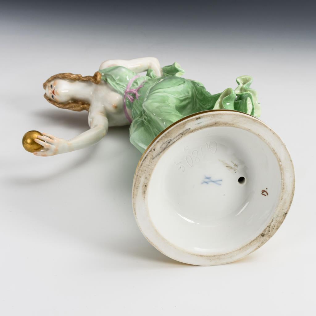 Bewegte Figur einer jungen, eine goldene Kugel werfenden Dame, auf profiliertem Rundsockel. 3 Efeublätter sowie Zeigefinger der rechten Hand restauriert.