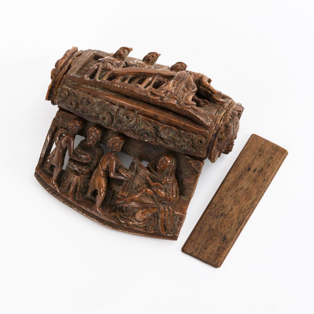 Tabatiere(?) with À-Jour carving on the main sides: Adoration of the Magi and Carrying of the Cross, respectively. At each end a reclining woman; the narrow sides with flowers. Hair crack at one end, inner lid possibly old renewed.