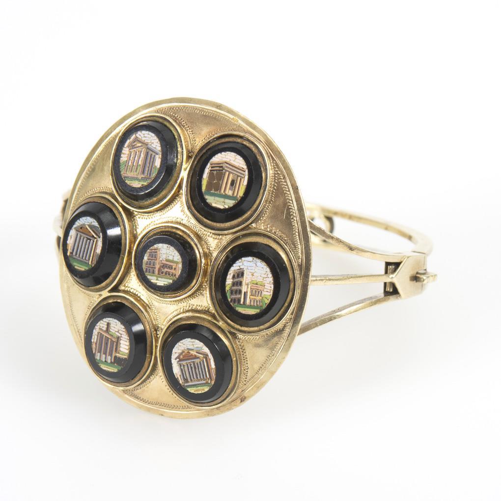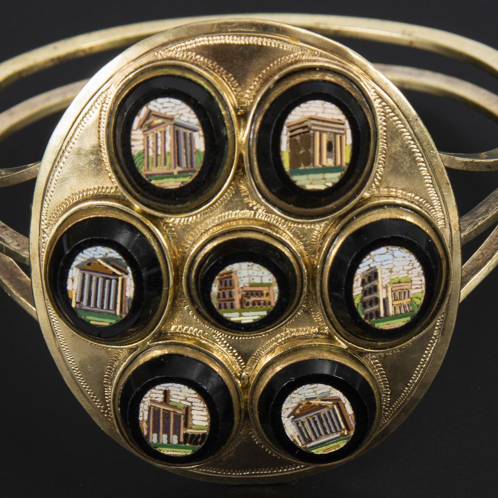 7 frame-set mosaics in black glass frames with antique architectural motifs on large plate and oval hinged hoop. Box lock.