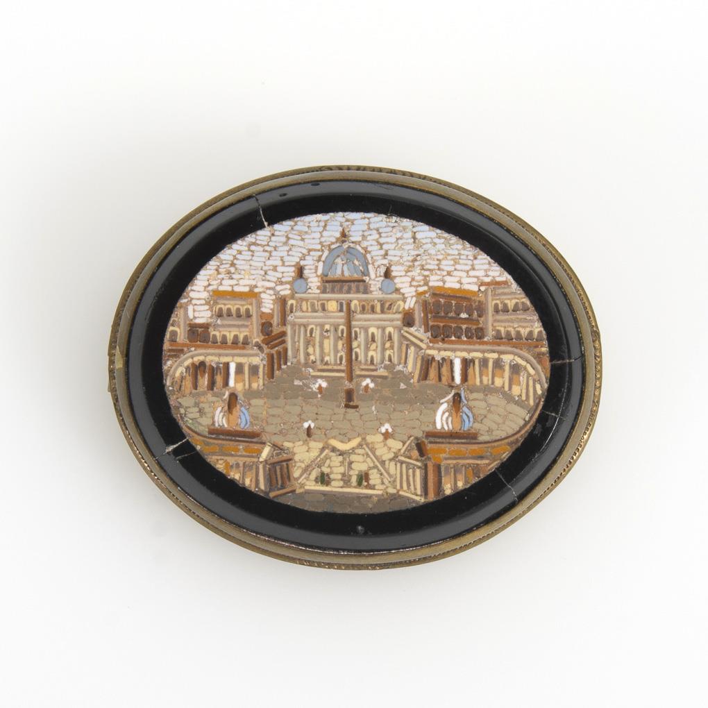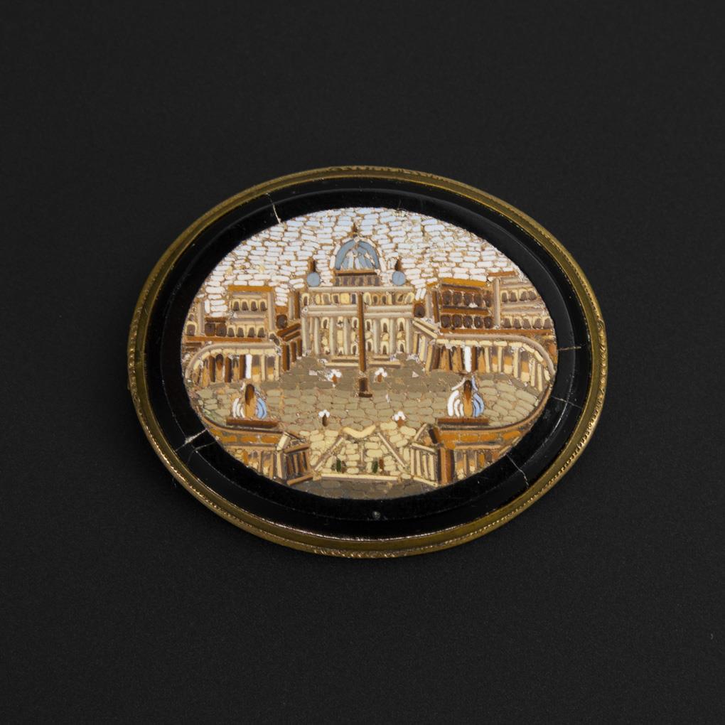 Mosaic with St. Peter's motif in closed metal frame. Ball hook. Black glass frame with scattered hairline cracks.