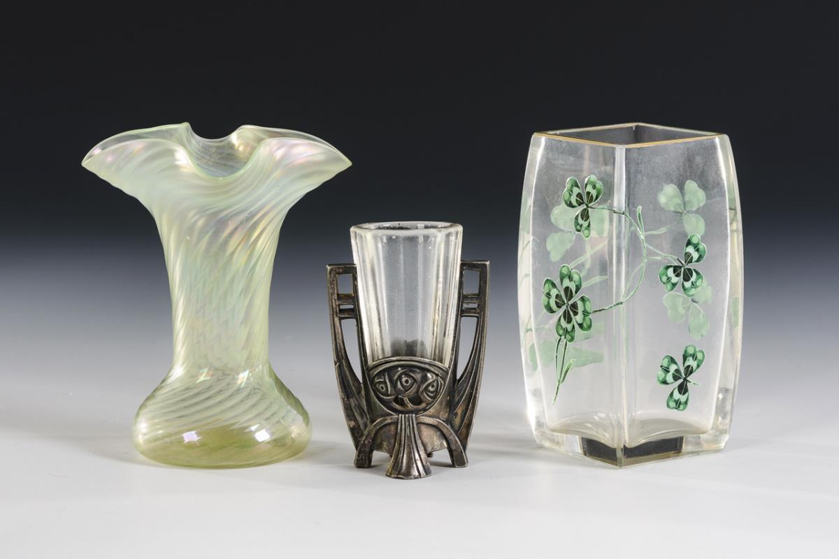 1x Flute vase of colourless glass with opal white and yellow marbled interior and relief gold staffage and the inscription "Sassnitz auf R." / 1x baluster vase "D'Argental", Paul Nicolas made of colorless glass with purple overlay and etched cherry branches. / 1x square vase of colorless glass with enamel painted shamrocks. / 1x oblique shape-blown vase of light greenish iridescent glass with fourfold overlapping mouth. / 1x cylinder vase of colorless glass with white-light green marbled inner catch, at the stand netted with green thread and the number "VI". / 1x faceted conical vase in a metal mount with two J-handles. Rim of the baluster vase bumped.