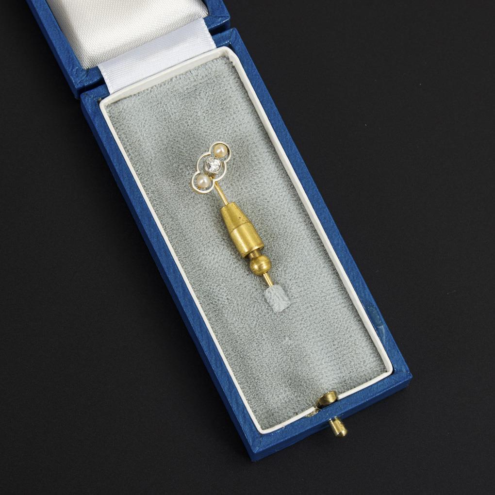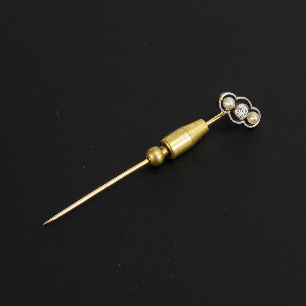 Front set diamond and 2 pearls on long pin. Metal slider.