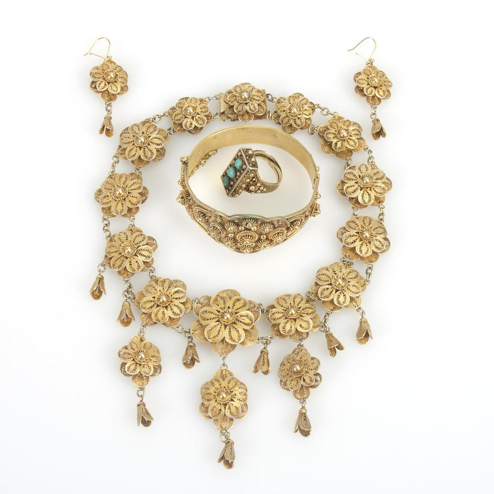 Silver tested, gold plated. Choker L 37 cm. Earrings L 6 cm. Bangle Ø 5,8 cm. Ring size 57-58. 116.3 g.