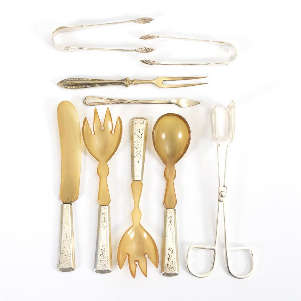 4 pieces of horn cutlery with silver handles engraved on both sides, silver pastry tongs, 2 sugar tongs, alpacca serving fork and spatula (plated). Partly signs of use.
