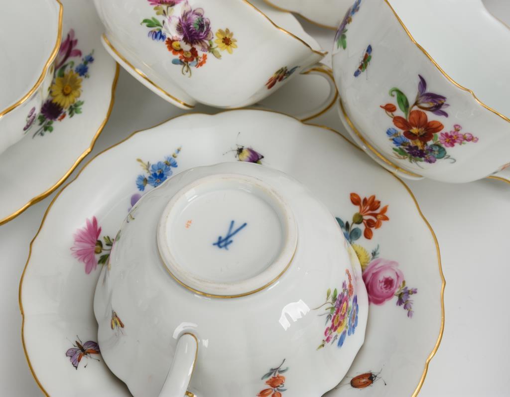 Form "Neuer Ausschnitt" mit polychromer Blumen- und Insektenmalerei. Teekanne (H 13,5 cm), 6 Teetassen, 6 Untertassen, 6 Frühstücksteller, 2 Väschen (H 8,5 cm). Rosenknauf bestoßen.