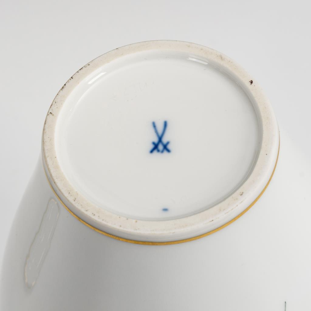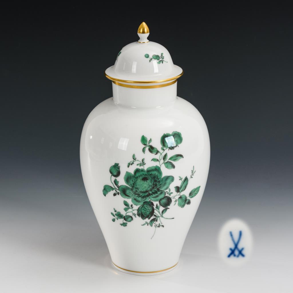 Balustervase mit Knaufdeckel. Schauseitig ein Blumenbukett.