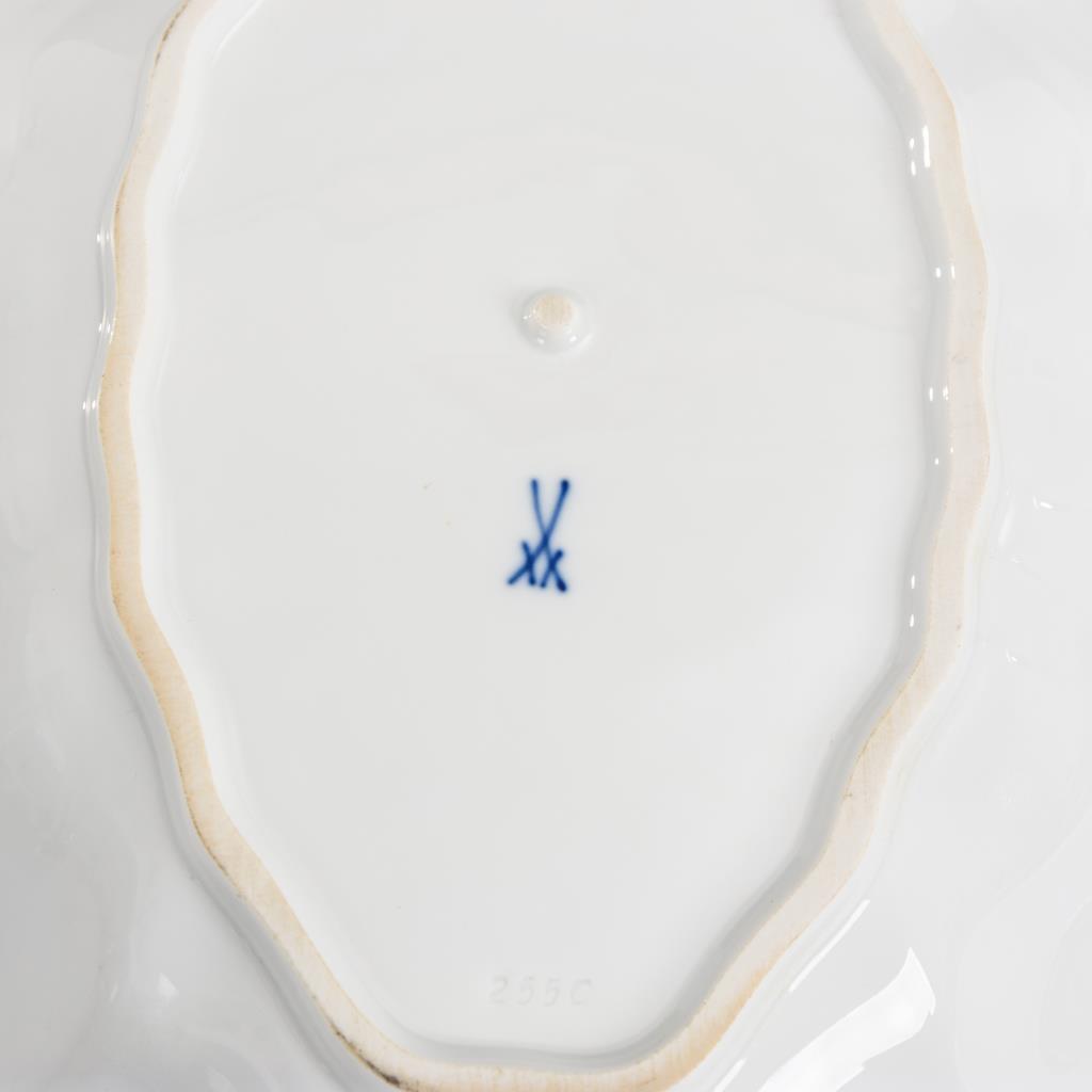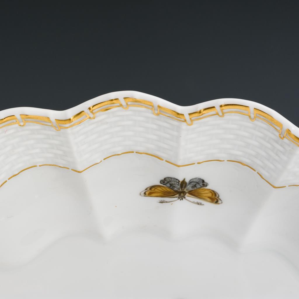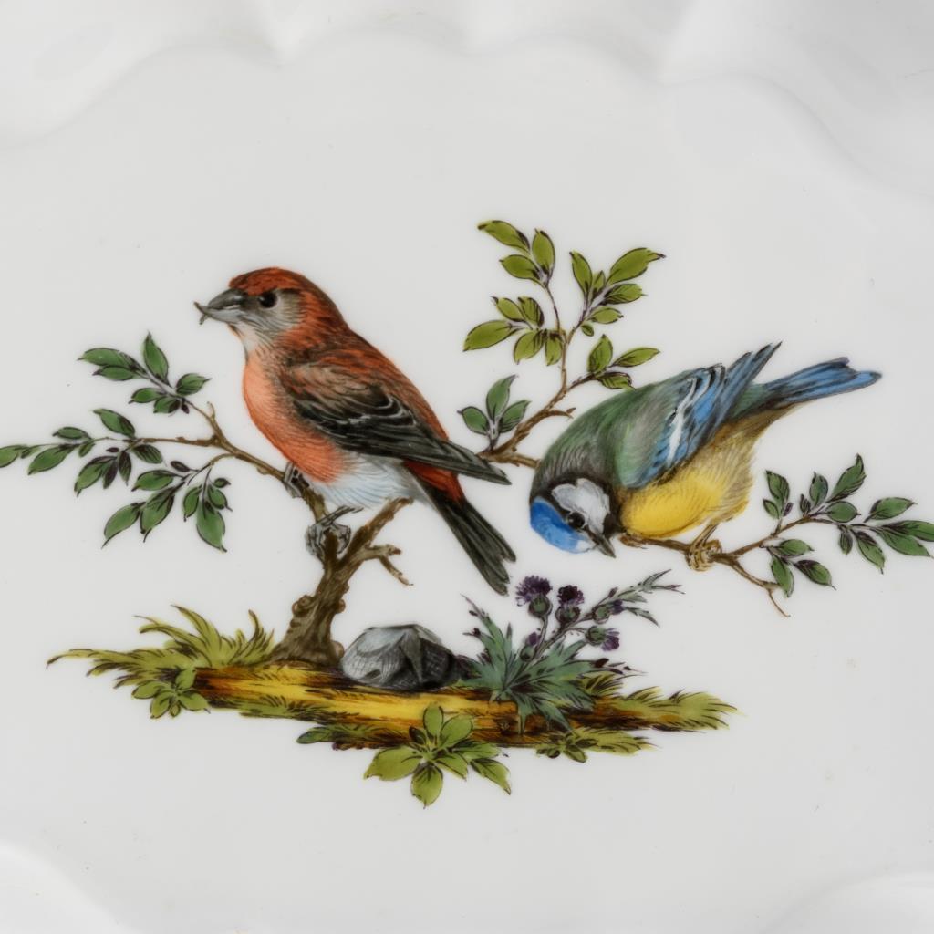 Ovale Schale mit Altozierrelief und mehrpassigem Rand. Im Spiegel zwei auf einem Baum sitzende Vögel, auf der Fahne kleine Insekten.