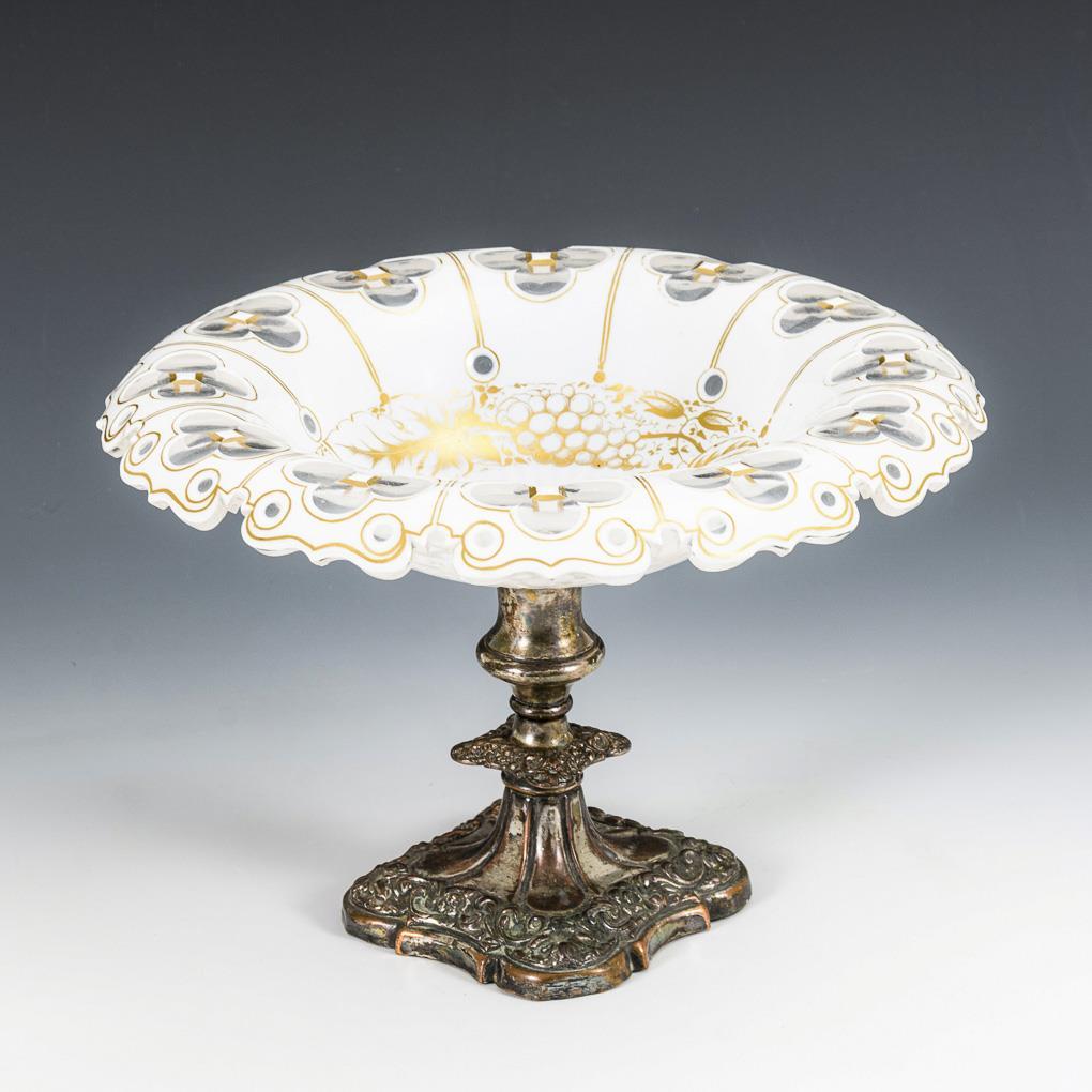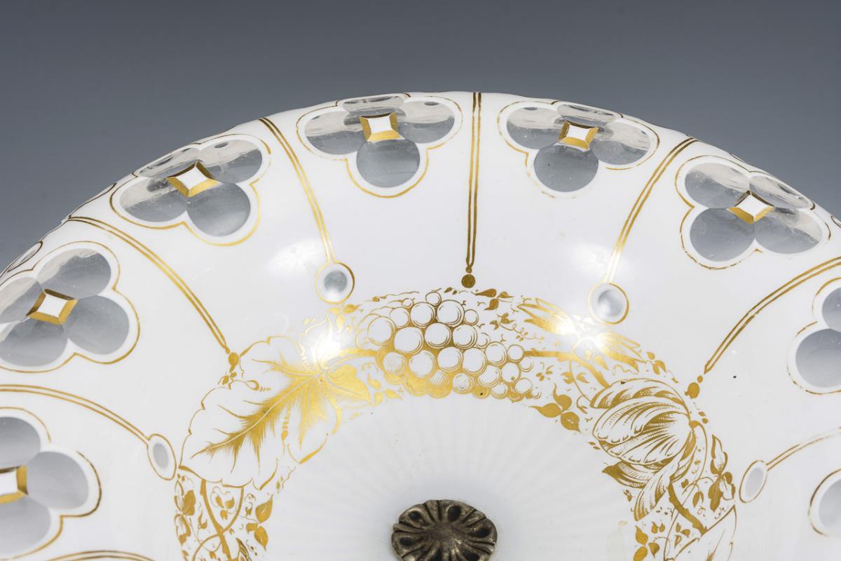 White bowl with lentil cut and gold painting. On relief foot. Mounting somewhat loose, silvering heavily rubbed.