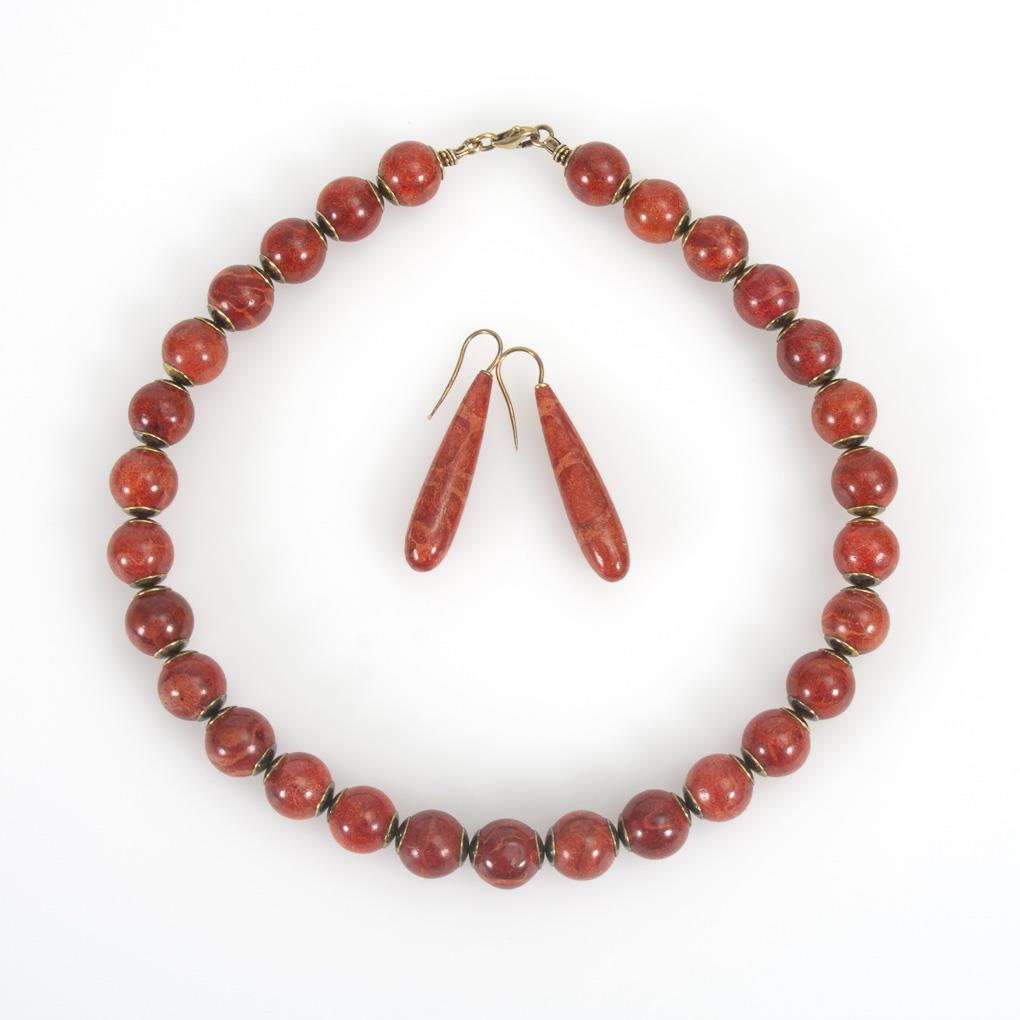Lace-up necklace with coral balls, on lobster clasp. Pair of drop earrings with large hook.