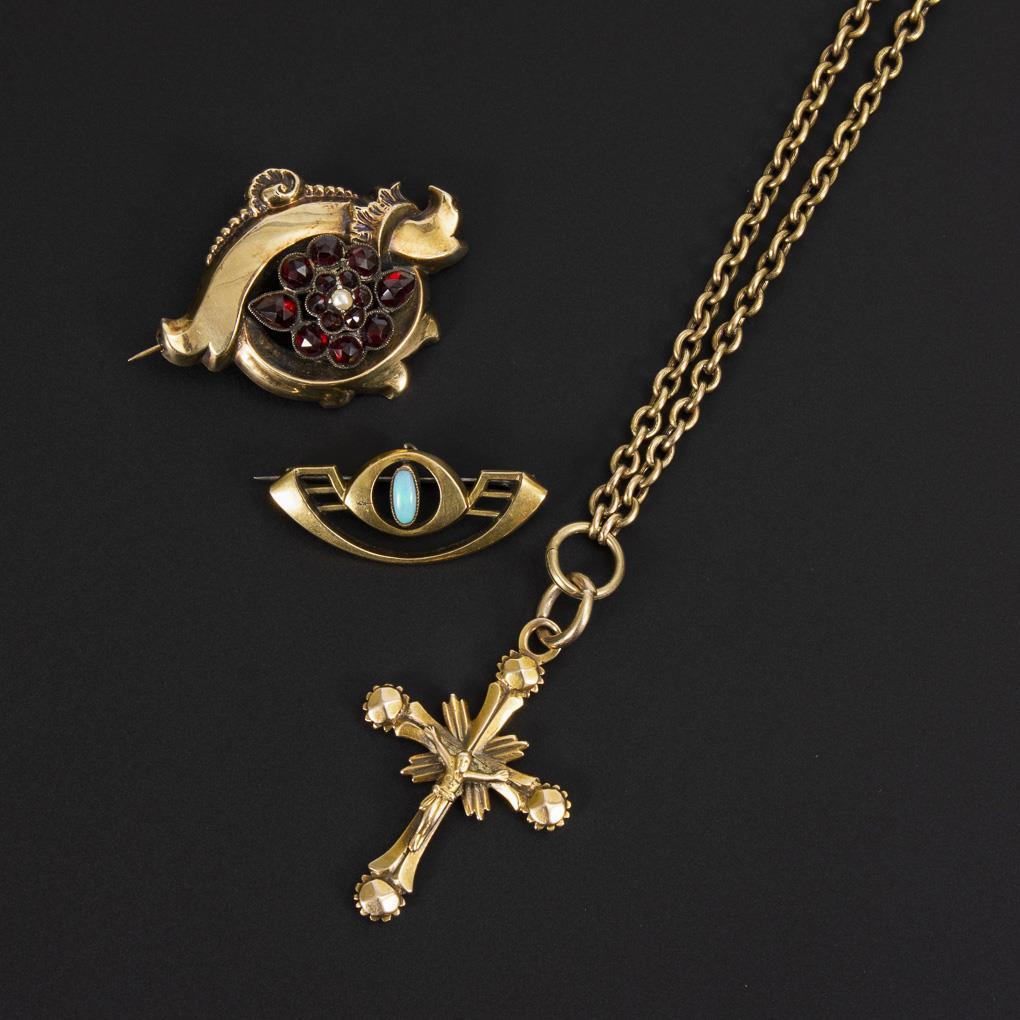Cross pendant on anchor chain with pin lock. Brooch with garnets and small brooch with opalcabochon. Hook clasps.