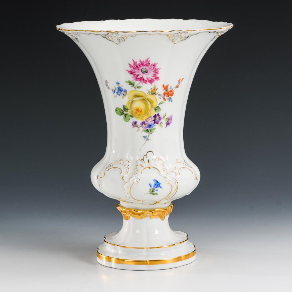 Kratervase mit teils goldbronziertem Rocaillerelief. Schauseitig ein Blumenbukett.