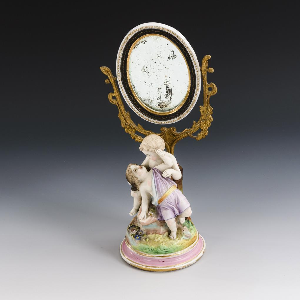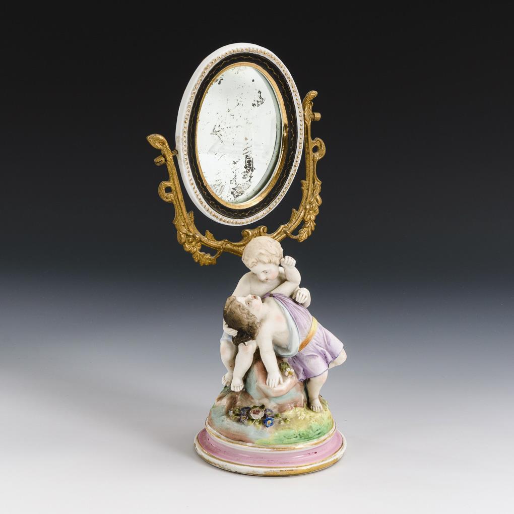 Pair of putti. Sitting on a rock pedestal in front of a pivoting mirror, gold rubbed.