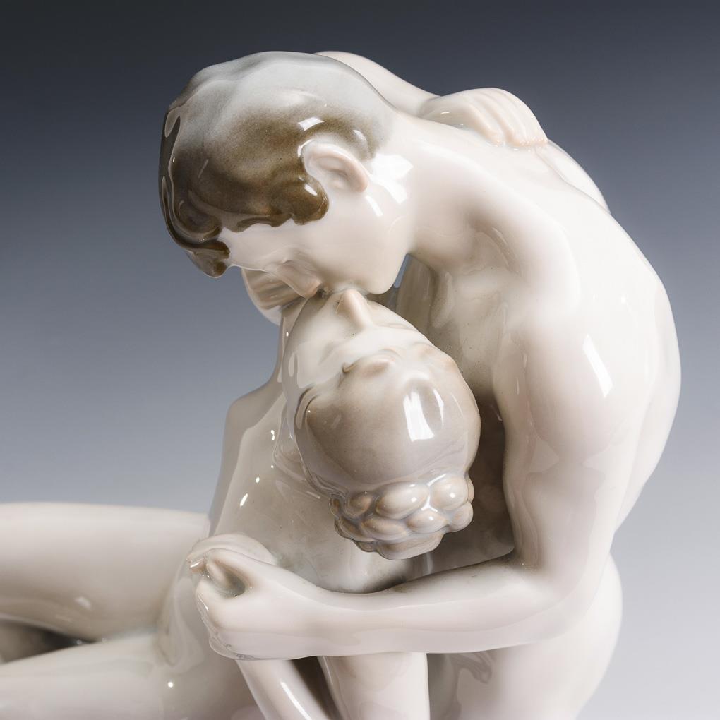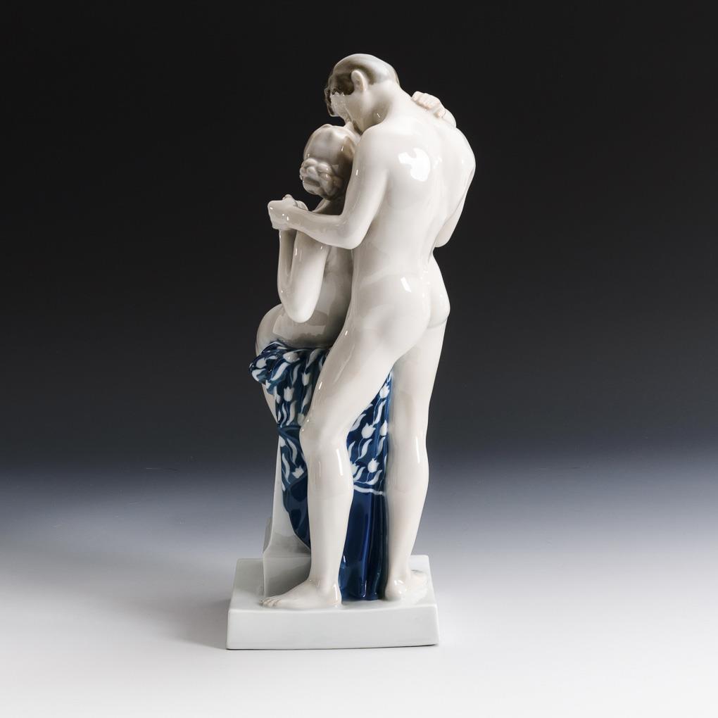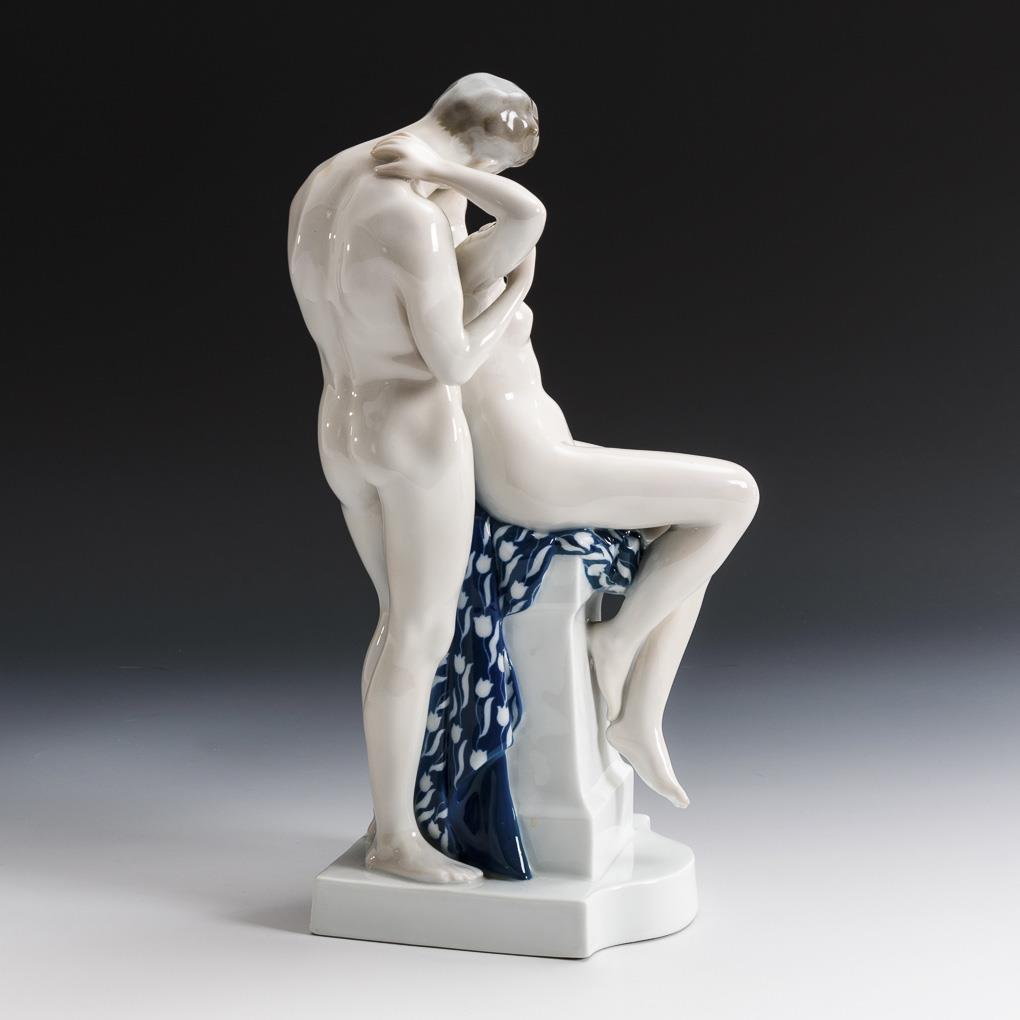 Nude depiction of a woman sitting on a pedestal, kissing the man standing behind her.