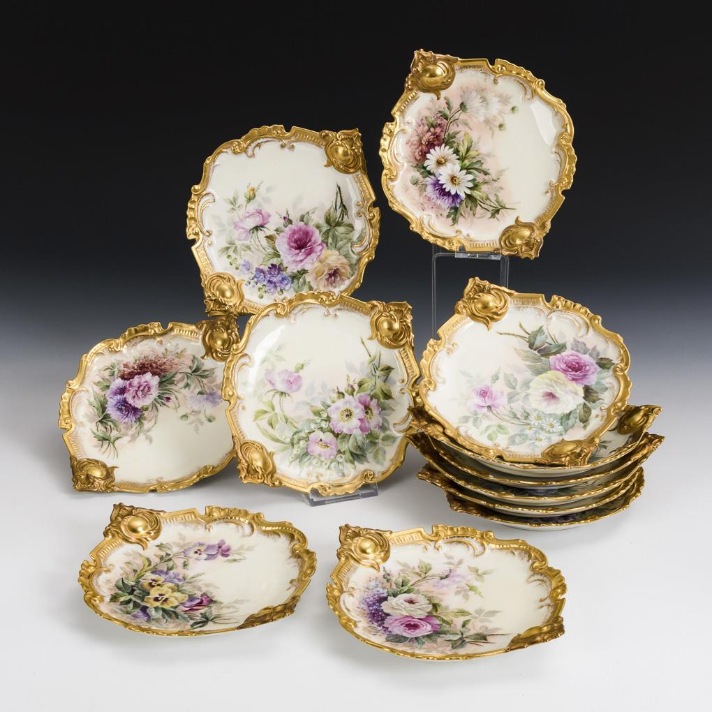 12 cake plates with gold decorated rocaillerie rim and a large floral bouquet in the mirror. 1 rim bump.