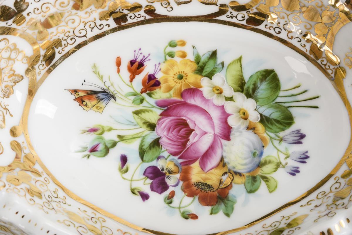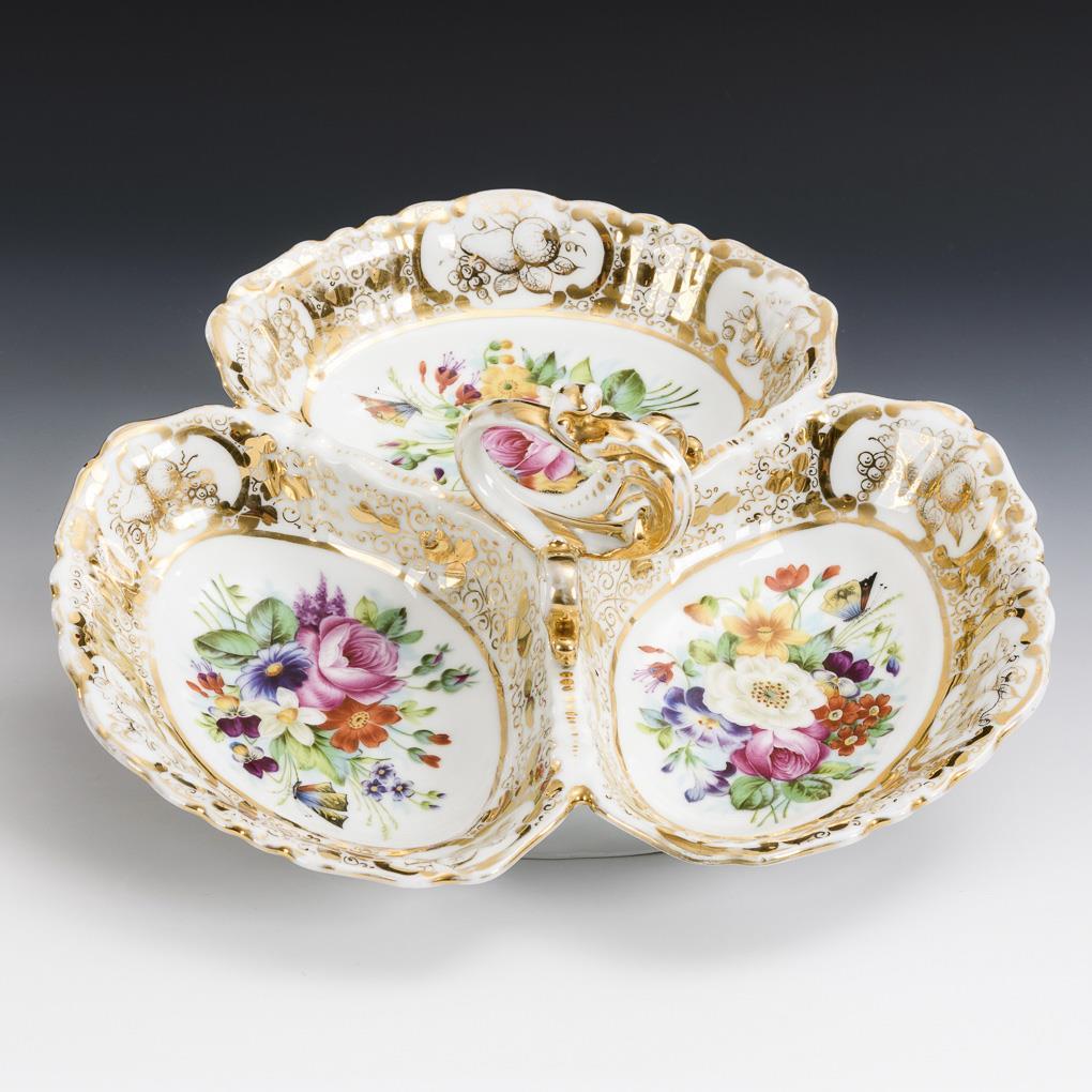 Three-piece bowl with central handle. In the mirror floral bouquets with butterflies, on the flag golden floral painting. Minimal gold abrasion, 1 wall hairline crack.