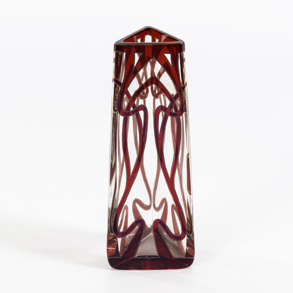 Colourless, partly red-stained glass, silver-filled. H 17.5 cm.