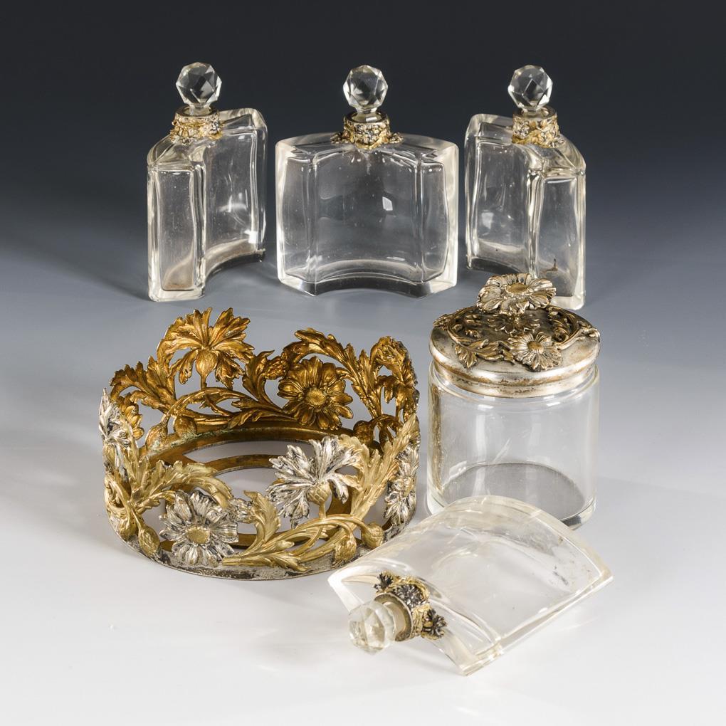 5-piece set with cylindrical box and 4 flacons enclosing the box. In decorative à jour crafted rack with cornflowers. Mouth rims of the flacons with breakouts.