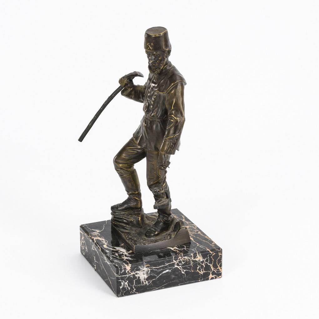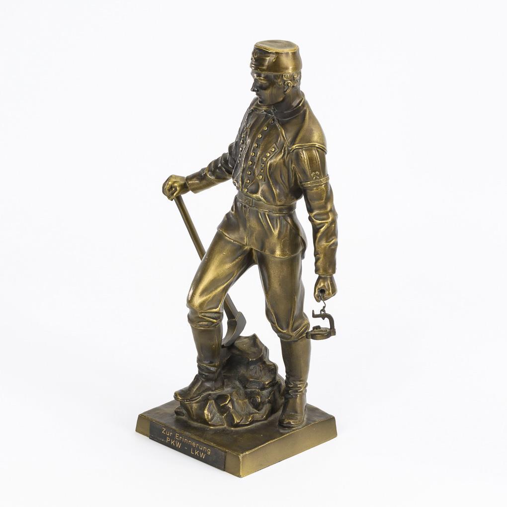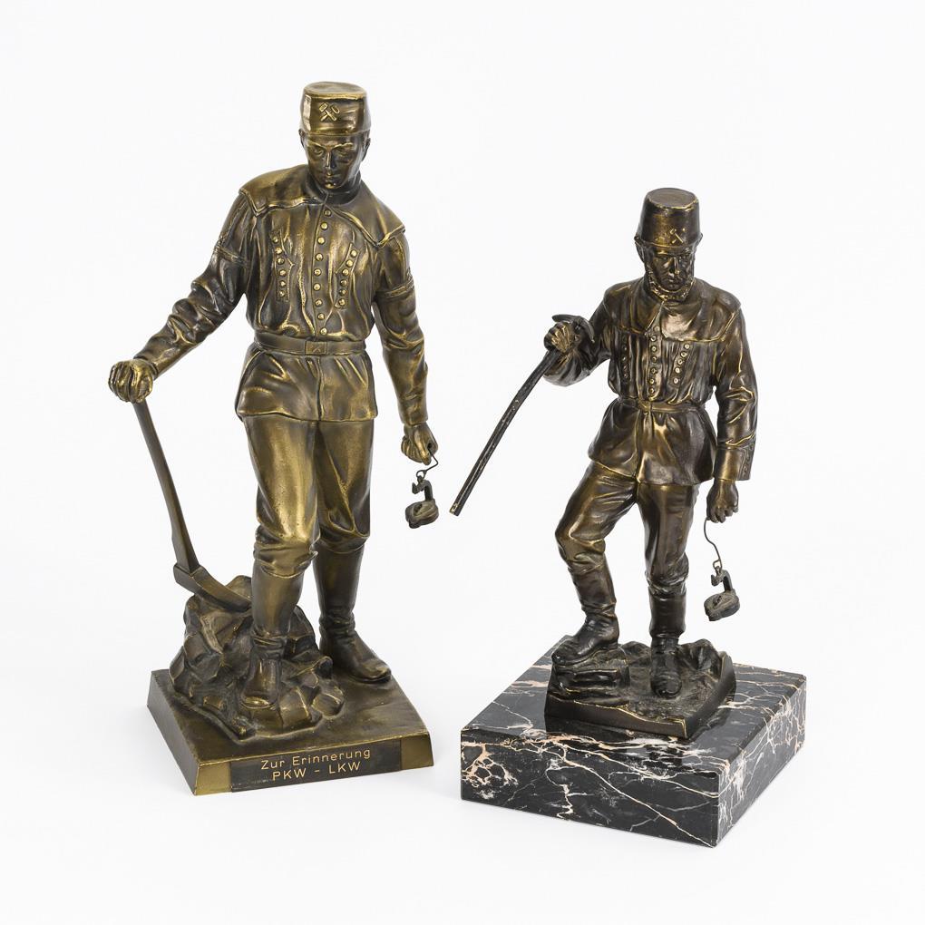 Single figures of miners each with frog lamp as well as wedge hoe and wing iron respectively. Addendum 25.10.21: H 31,5 and 36 cm. Minimal signs of age/use.