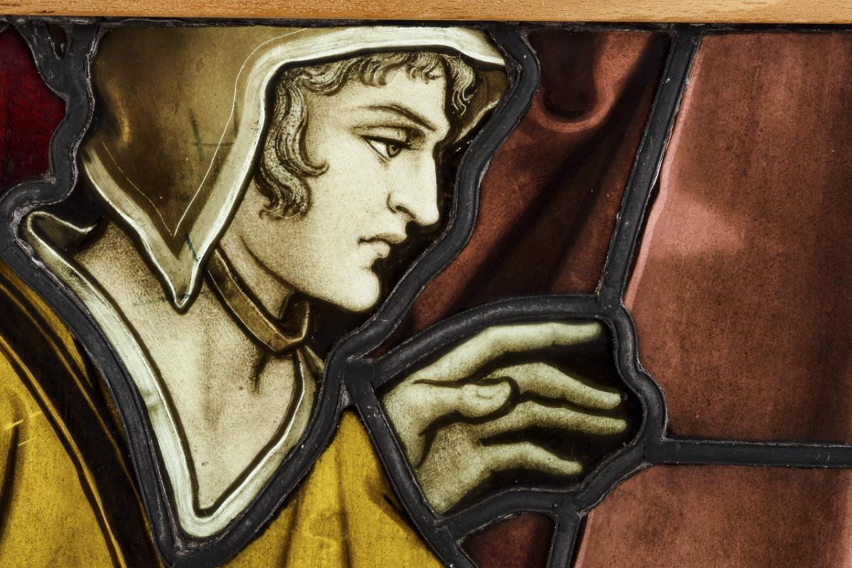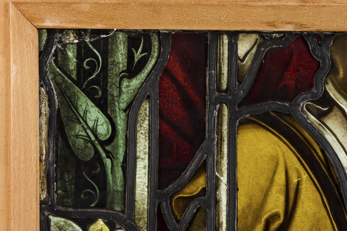 Clear glass and colored glass, partly painted, lead rods, light wooden frame. 64 x 53 cm, frame 74 x 62 cm.