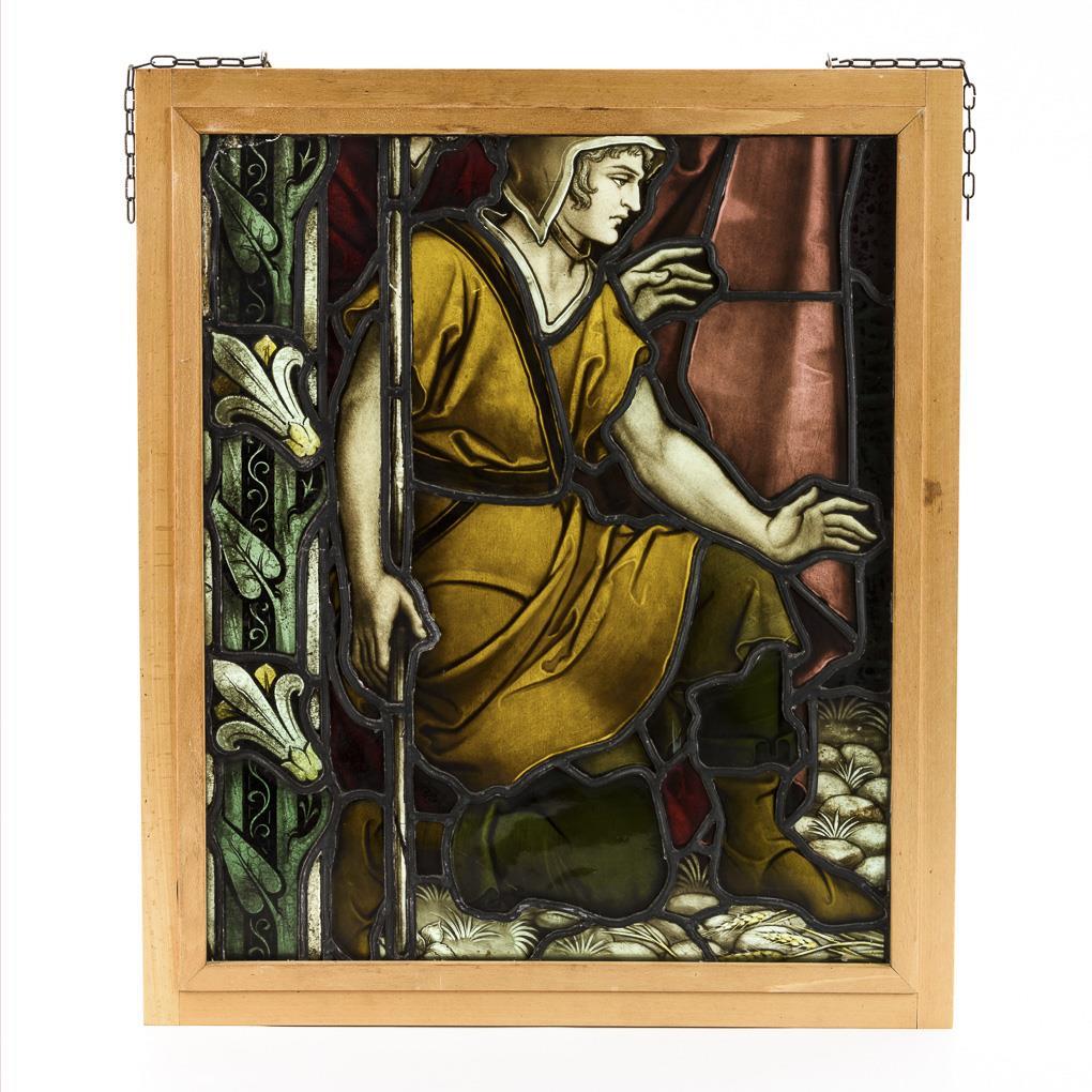 Framed leaded glass window: Kneeling young man.