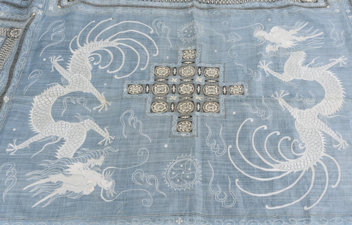 Fine cloth with large embroidered dragon motifs, floral embroidery and Asian characters. Interspersed with various handmade lace inserts. Partial edge stains.
