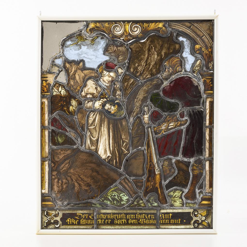 The hunter with hunted down stag as well as lady-in-waiting attaching the break sign to the hat; below meaning saying. 1 small glass crack, some glasses replaced, strong signs of age/use.
