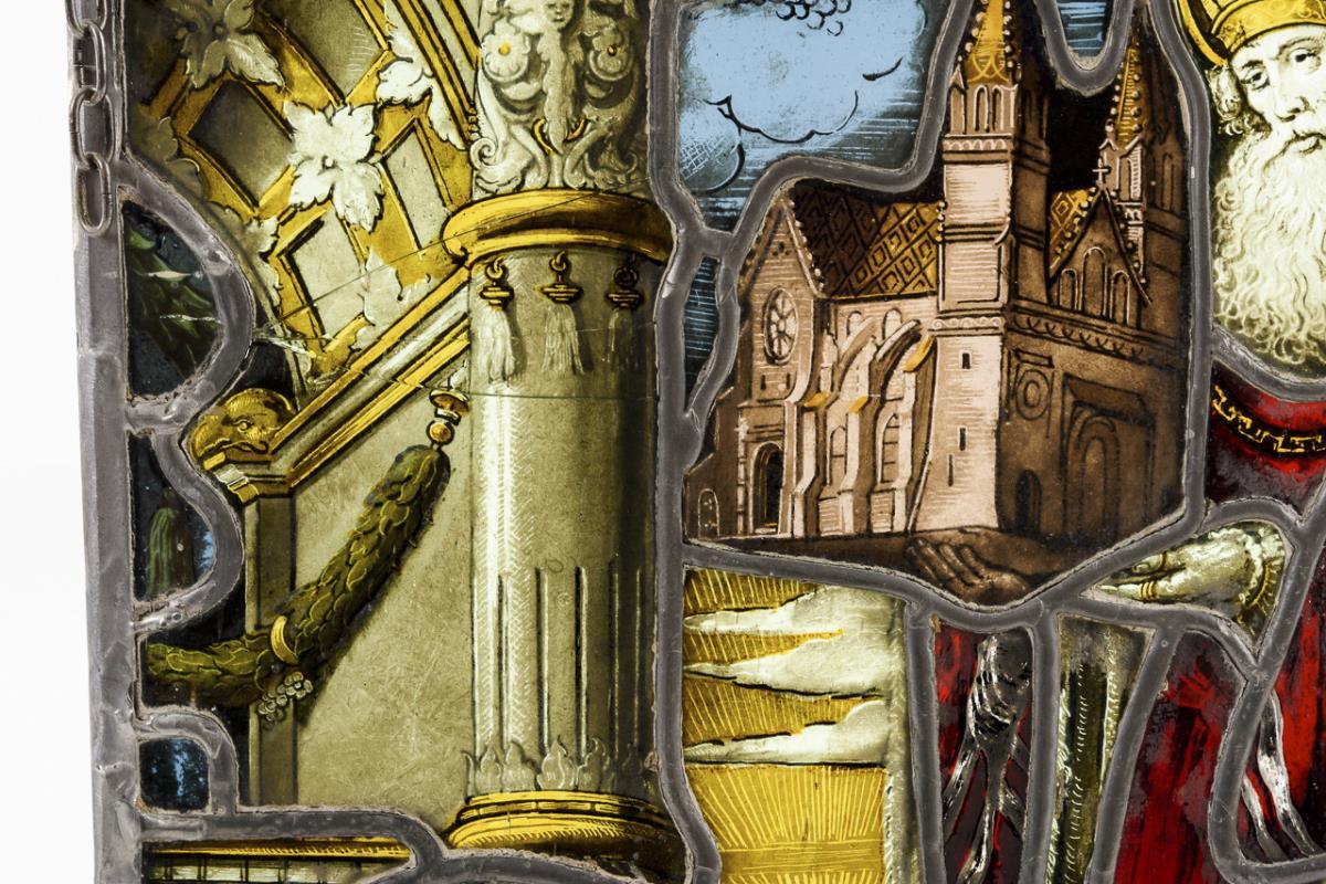 Probably from a larger context depicting the standing abbot with church model as well as inscription with date "1549". 1 glass cracked, several repairs with lead rods, some signs of age/use.
