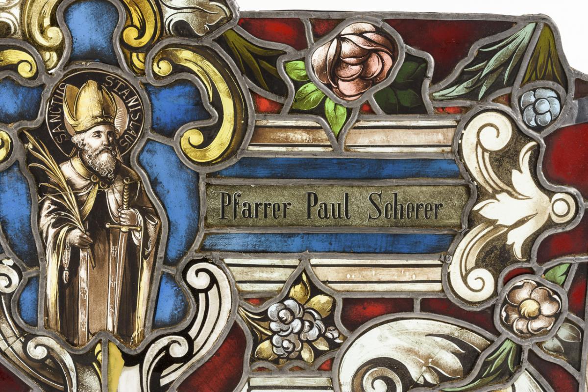Probably from a church window with the Holy Bishop and floral ornament and note: "Donated by Pastor Paul Scherer". Some broken glass and repairs, strong signs of age/use.