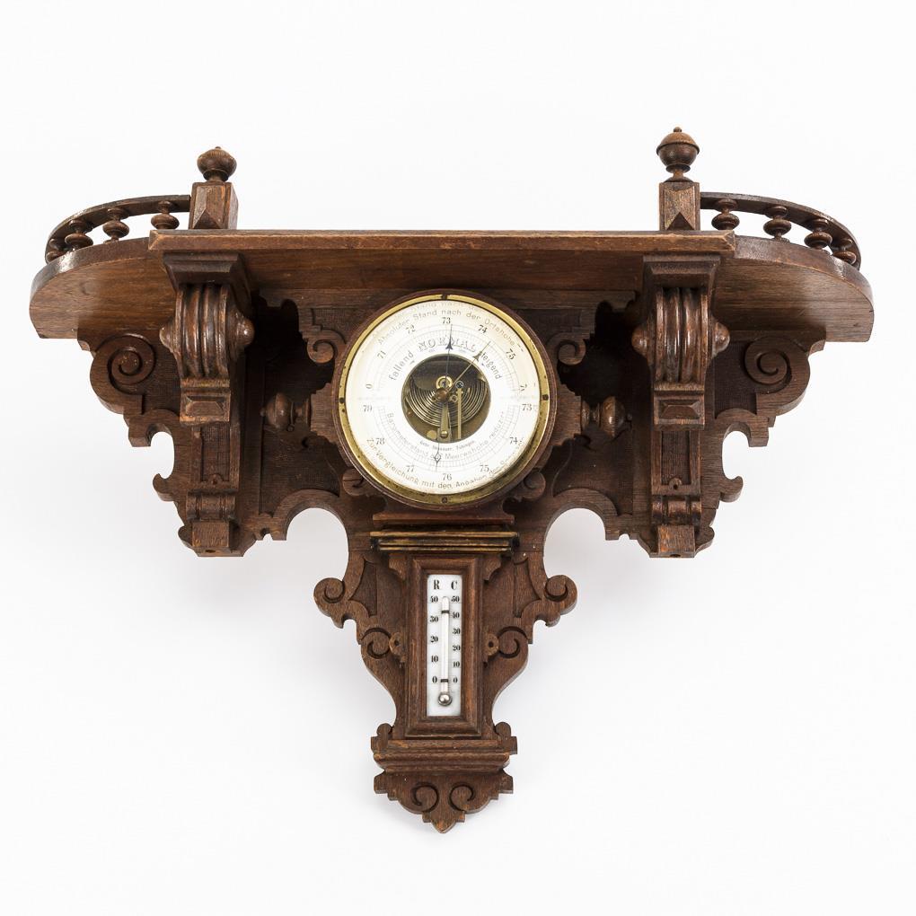 Richly decorated console with baluster crowning; integrated barometer with scales each for local altitude and sea level as well as mercury thermometer. Minor missing parts (on balustrade, 2 pegs missing, 1 added), few signs of age/use.