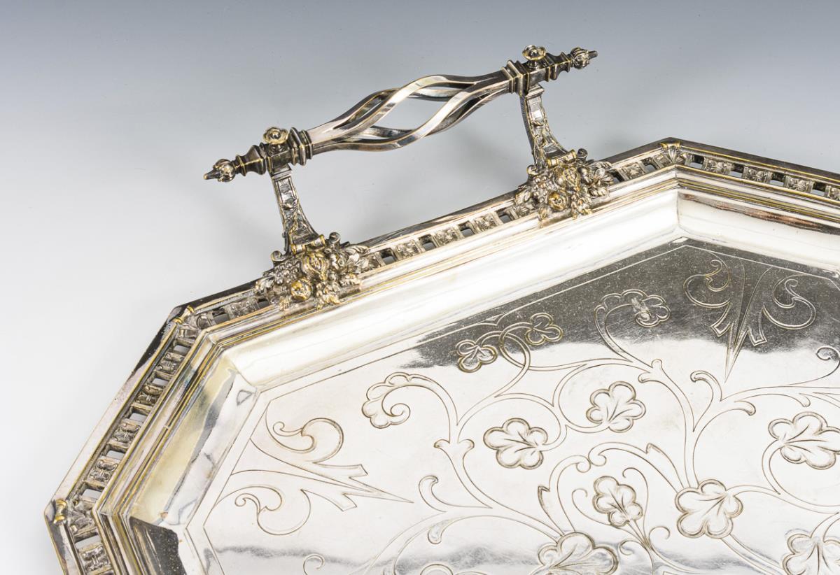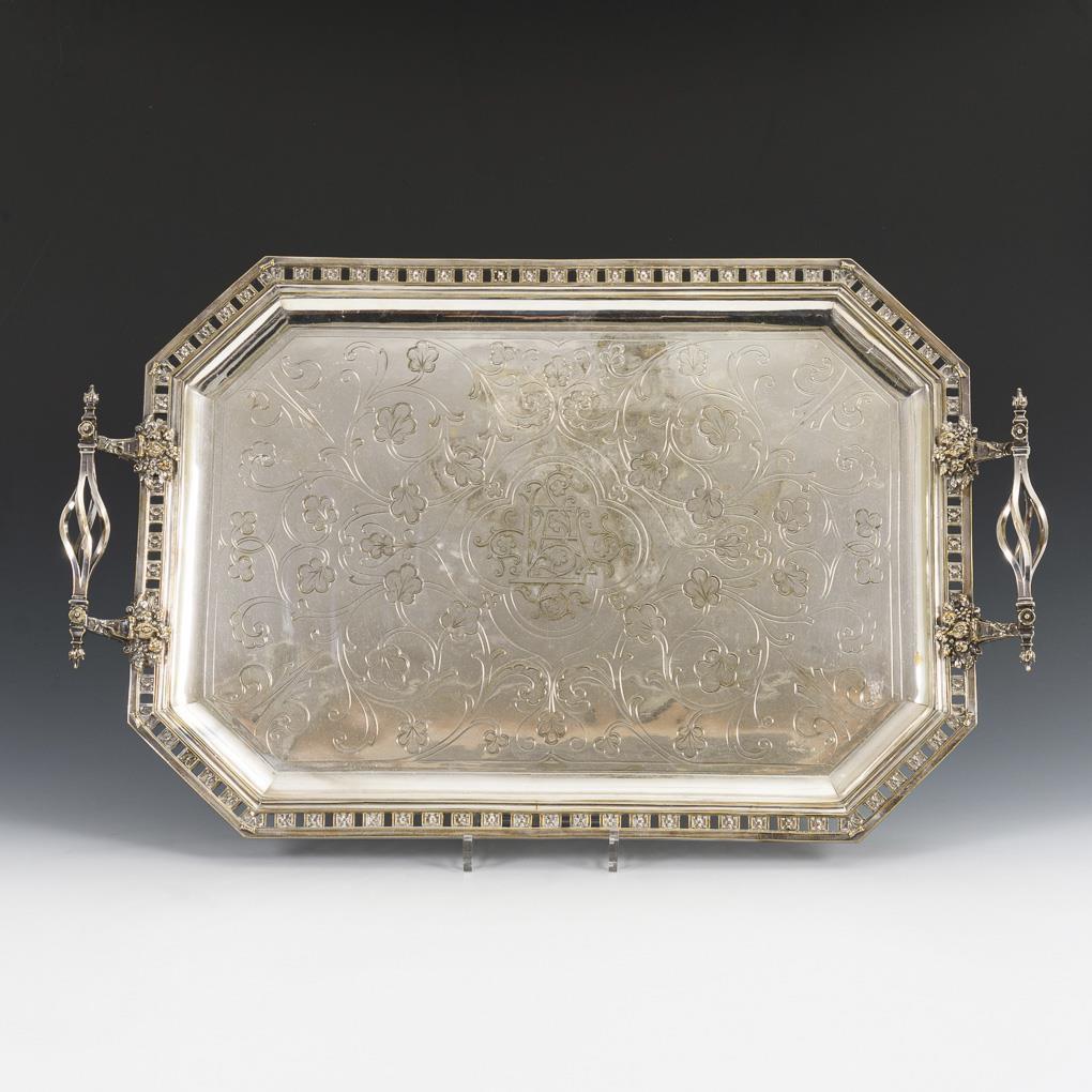 Very large and heavy handle tray with foliate vine and monogram engraving "LA". Signs of use, silver plating partially rubbed.