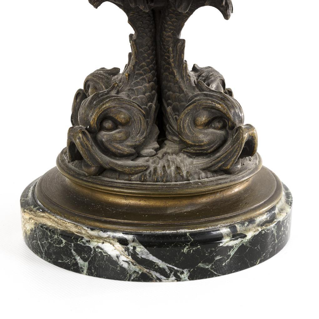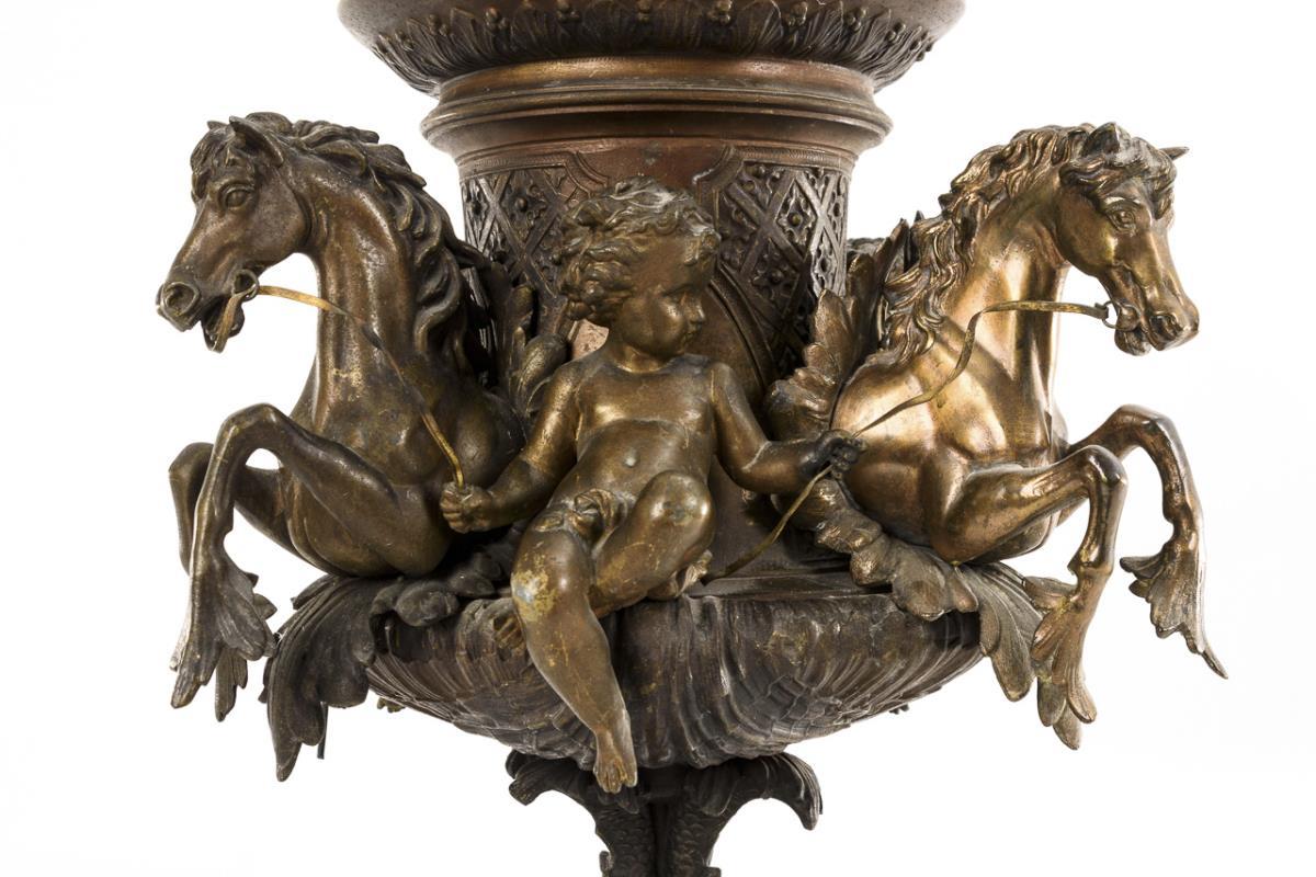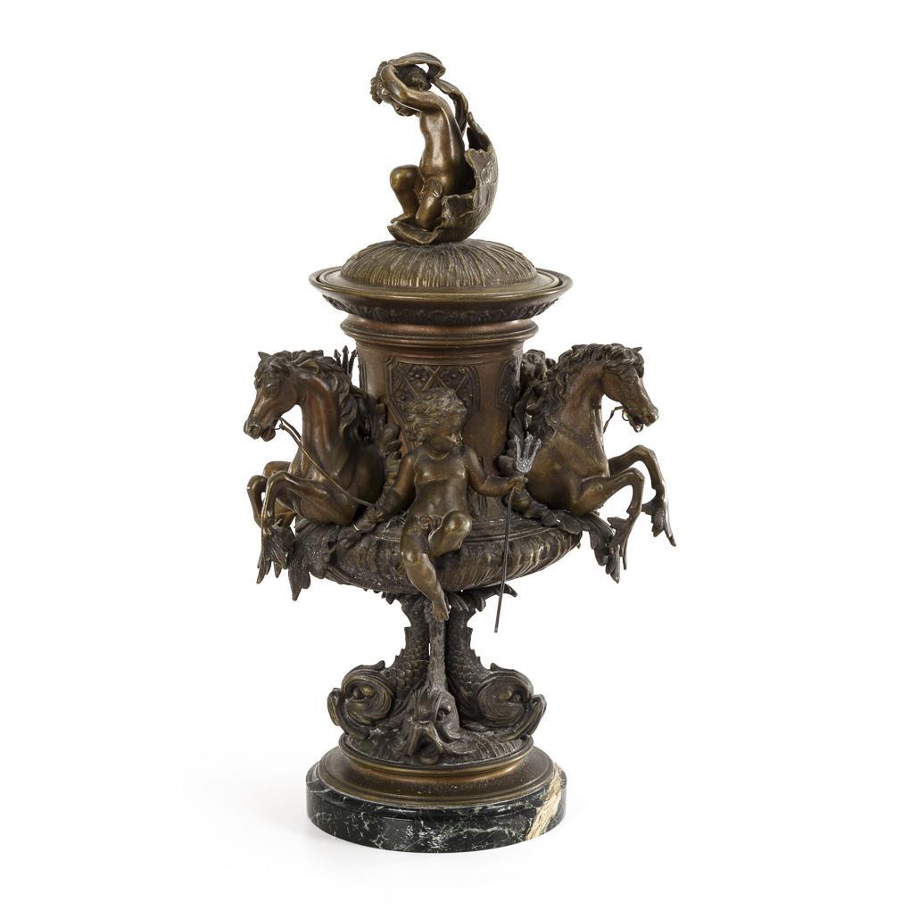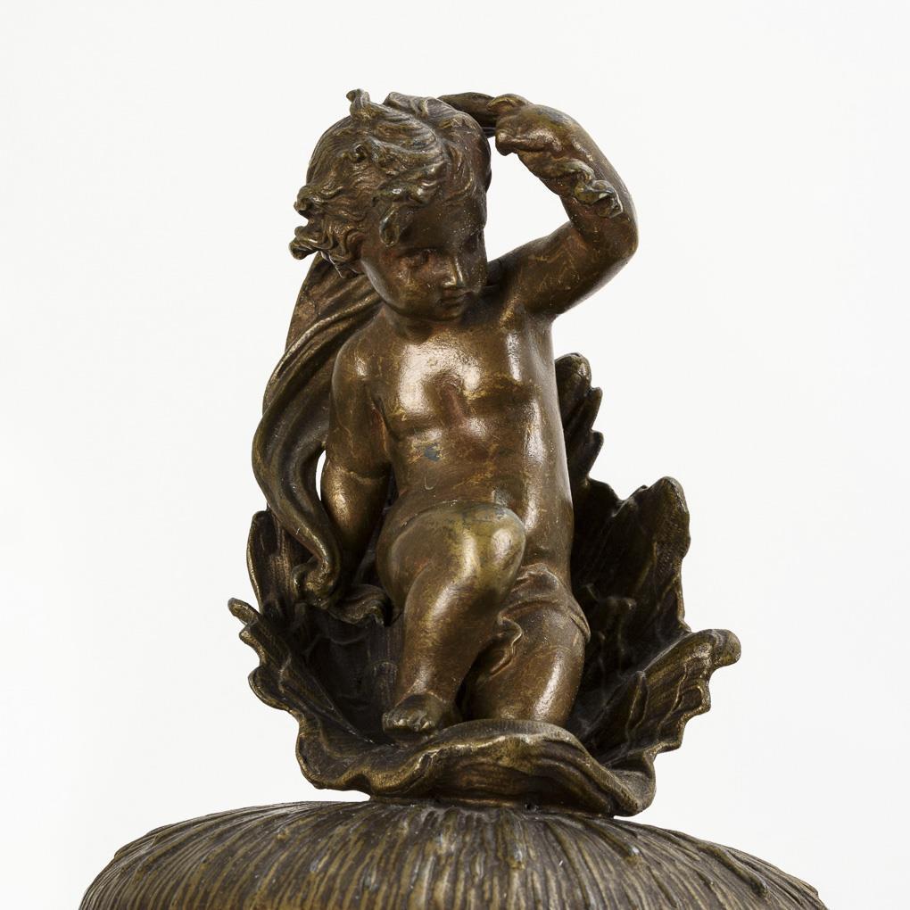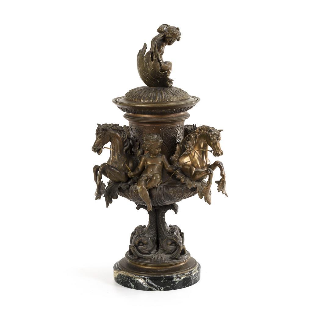 Splendid vase with 4 dolphins as foot. On the body applied 3 putti (partly with trident) between the hippocampal protomes; on the lid a putto in a shell. Plinthe glued, signs of age/use.
