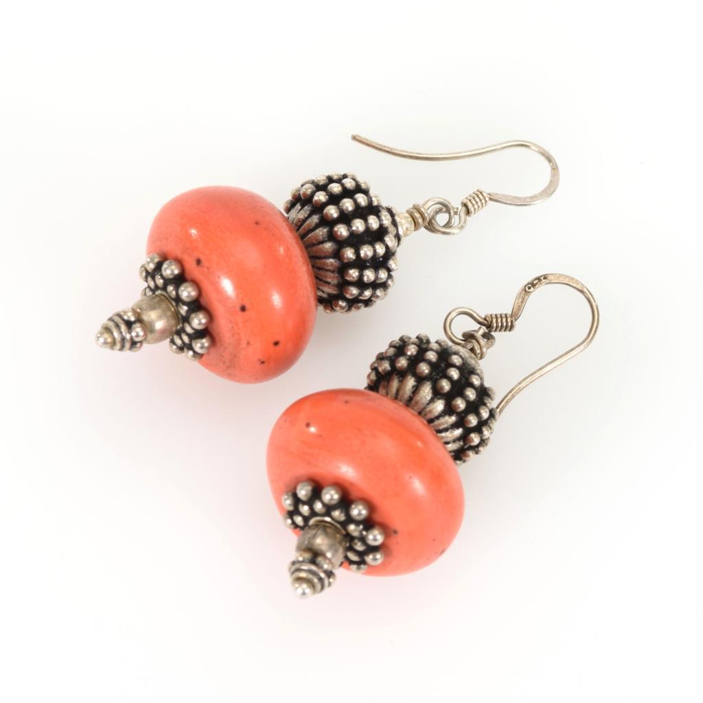 Lachsfarbene, gedrückte Korallenkugel, zwischen granalienverzierten Silbersegmenten, an Einhängehaken.