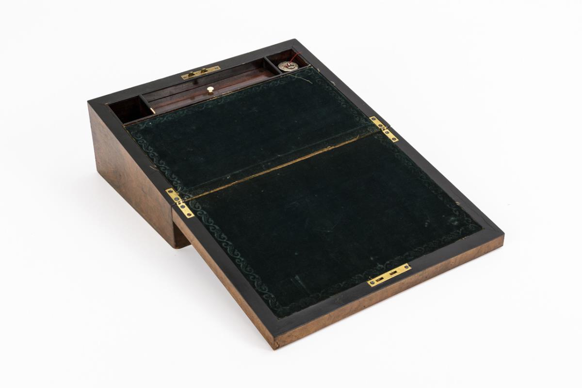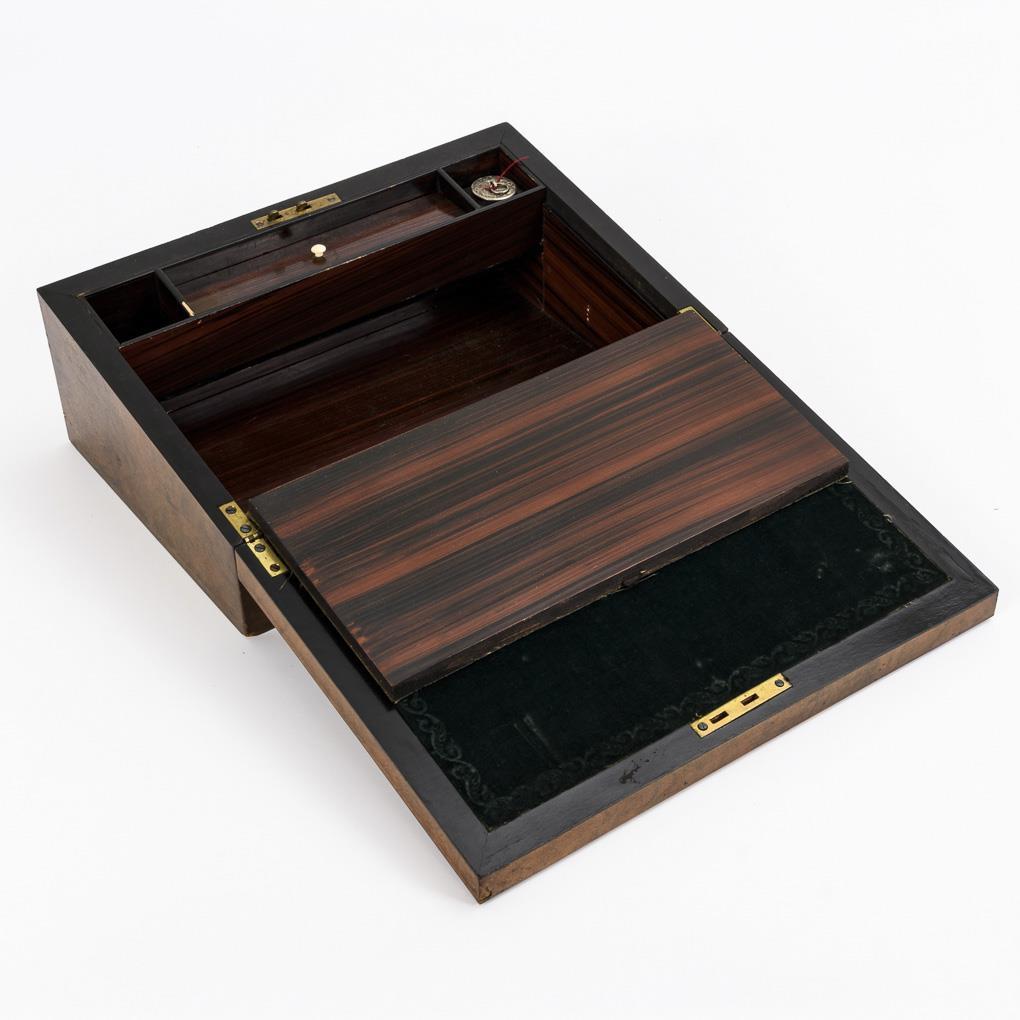 Sloping desk casket with blank escutcheon on hinged lid. Inside writing surface partly over hollow compartment as well as small compartments, 1 inkwell. Inkwell and key probably supplemented, cloth cover torn, otherwise hardly any signs of age/use.