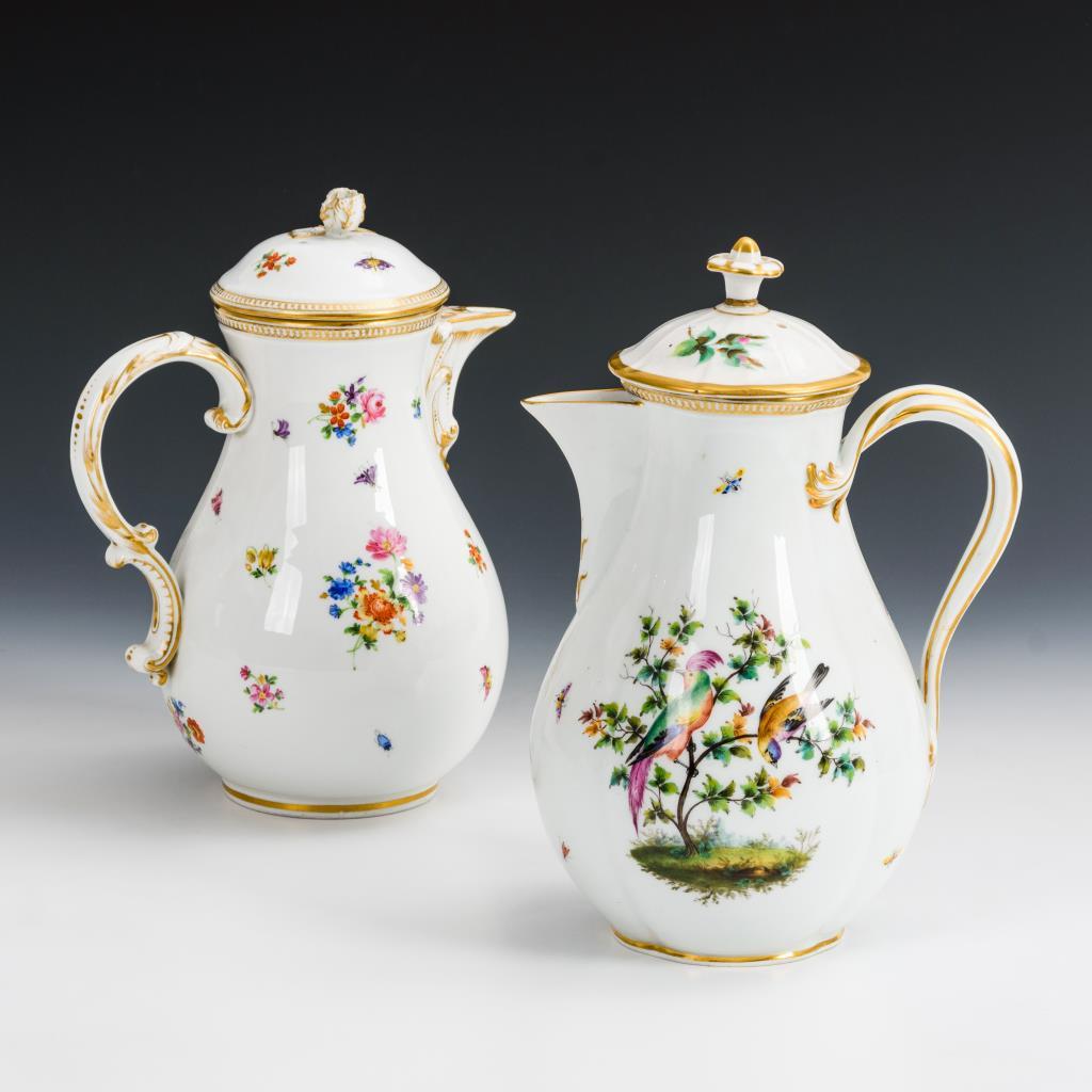 1x Form "Neuer Ausschnitt" mit Blumenmalerei. 1x Vierpasskanne mit Vogelmalerei. 1 Deckel ergänzt, Rosenknauf bestoßen, 1 Deckelnase fehlt, partiell minimaler Goldabrieb.