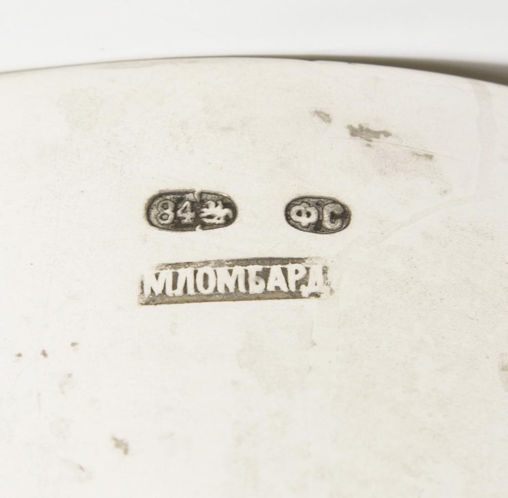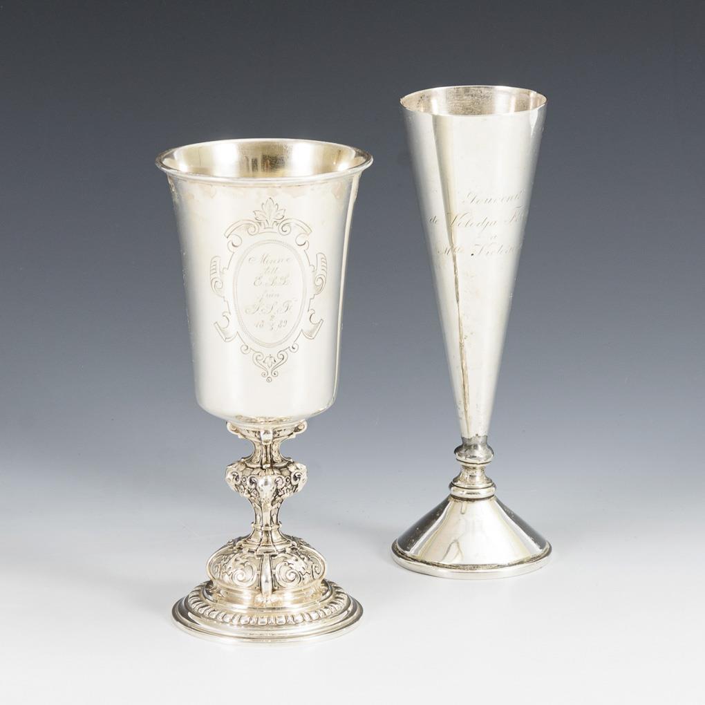 Russian champagne goblet with dedication engraving in French Swedish goblet with founding period relief foot and dedication on the dome, dated: "2. 3. 1889". Slight dents, champagne goblet with soldered joint at the base.